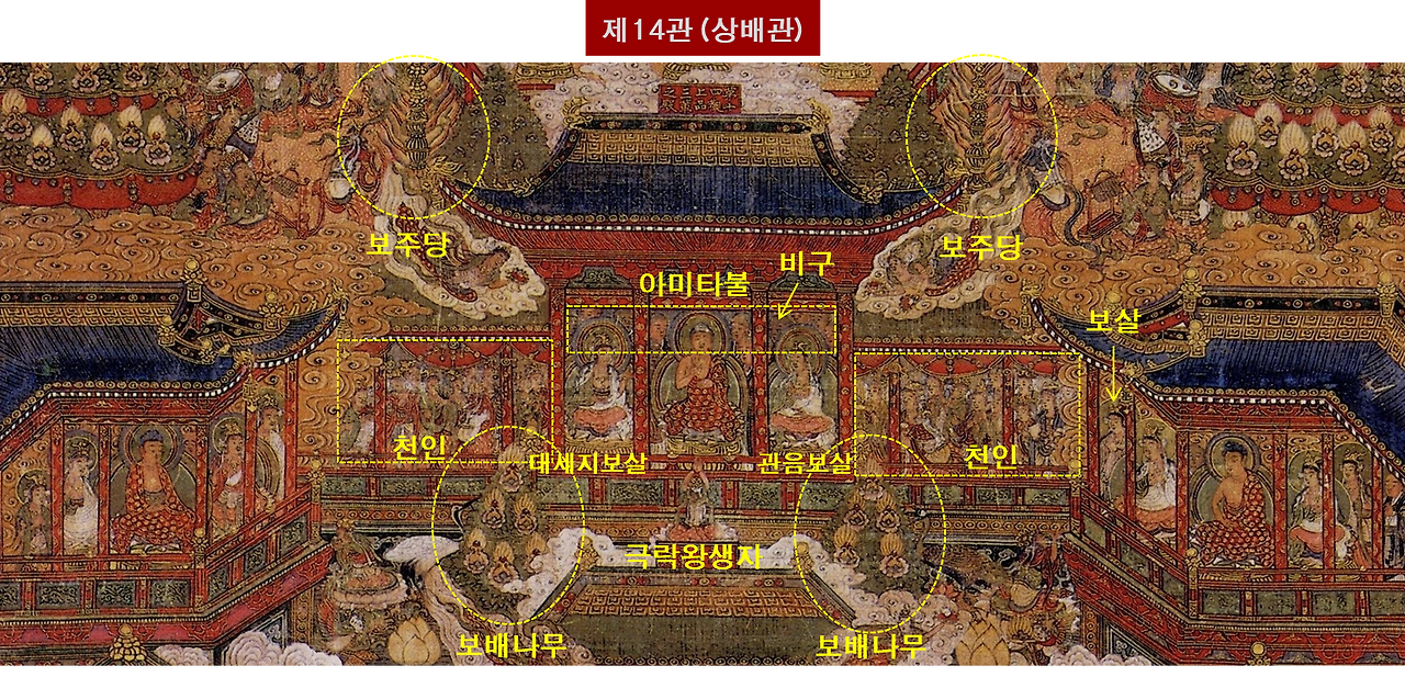 상배관(제14관)에서 정면의 전각이 상품상생 극락(AAA 등급의 극락)이다. 관람자 시선으로 우측(향우)의 전각이 상품중생 극락(AA 등급의 극락)이고, 향좌의 극락이 상품하생 극락(A 등급의 극락)이다. 각 전각마다 아미타 삼존이 극락왕생자를 맞이하고, 아미타삼존 등 뒤에는 수많은 비구가 서서 극락왕생자를 맞이하고, 전각과 전각을 잇는 회랑에는 천인들이 춤을 추고 찬불가를 연주하며 극락왕생자를 환영하고 있다.