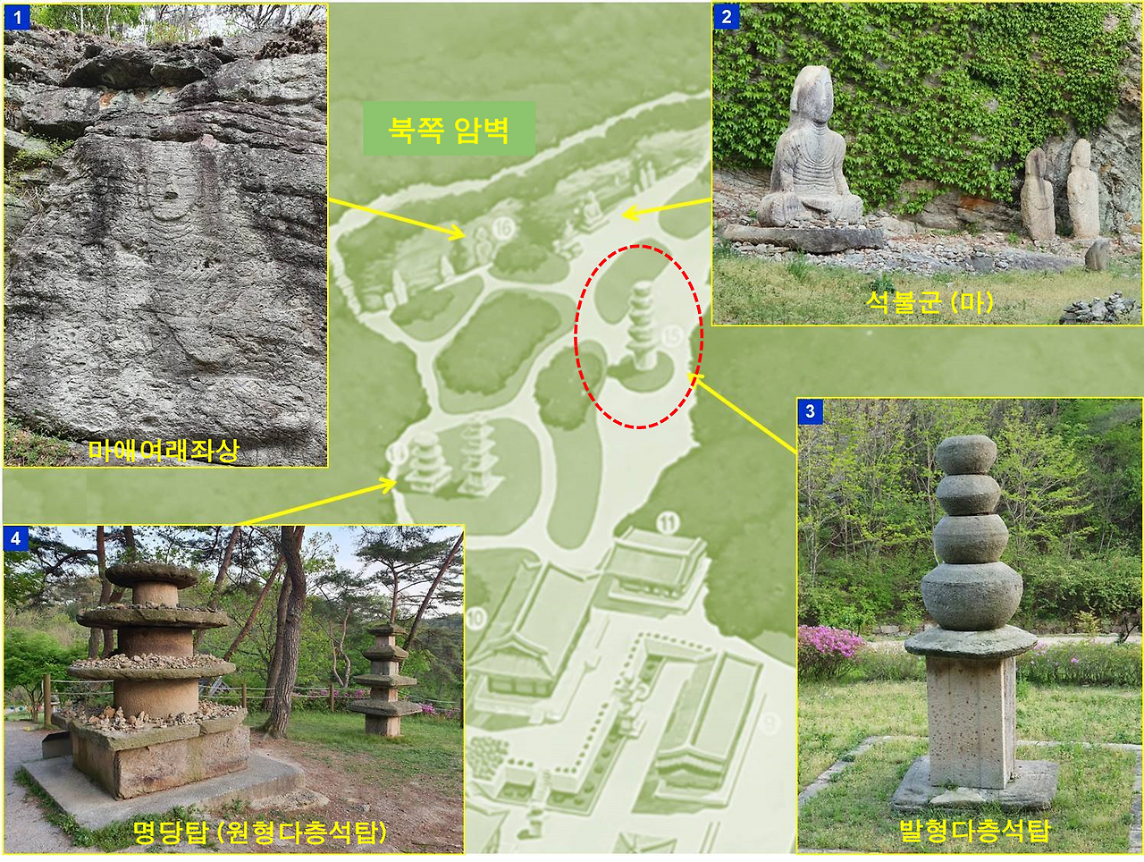 <사진 2> 천불천탑 북쪽 암벽 공간에 남아 있는 조형물(시계 방향으로): 마애여래좌상, 석불군(마), 발형다층석탑, 그리고 명당탑(원형다층석탑)과 방형석탑
