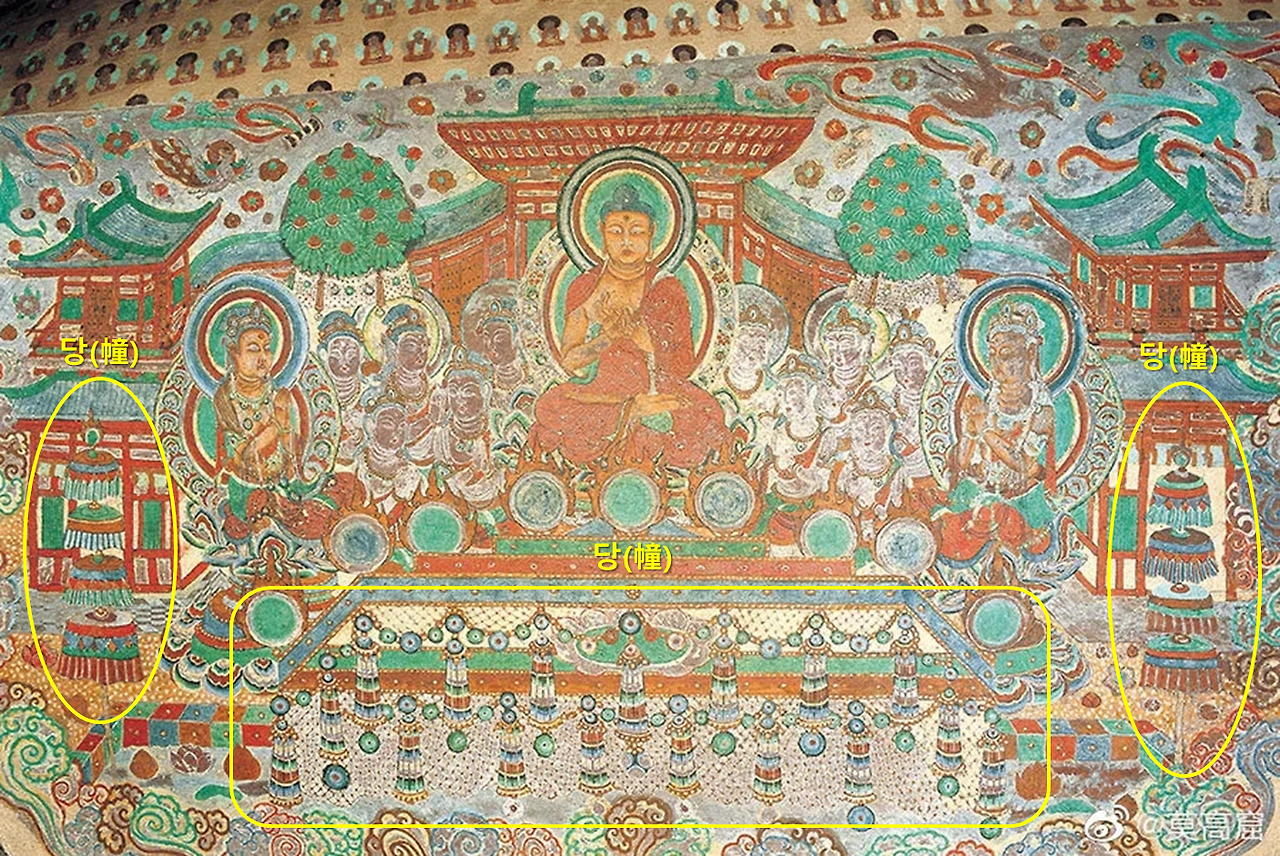 중국 당(唐) 대에 제작된 둔황석굴의 아미타경 및 관무량수경 변상도를 살펴보면, 연화대좌에 좌정한 아미타불의 주변을 장엄하기 위해 당(다층보당)을 설치했음을 볼 수 있다. 중국의 보당은 크기와 모양이 다른 당을 여러 층 쌓아 올려 마치 거대한 석탑처럼 보인다. 또 다층보당은 보배 연못 위에 줄을 치고 연등처럼 매달아 두기도 하였다. 반면에, 앞의 <사진 6>에서 보았듯이 인송사장 고려 <관경16관변상도>에서는 다층보당이 마치 현대사회의 스탠드 옷걸이처럼 길쭉하게 묘사되었다.