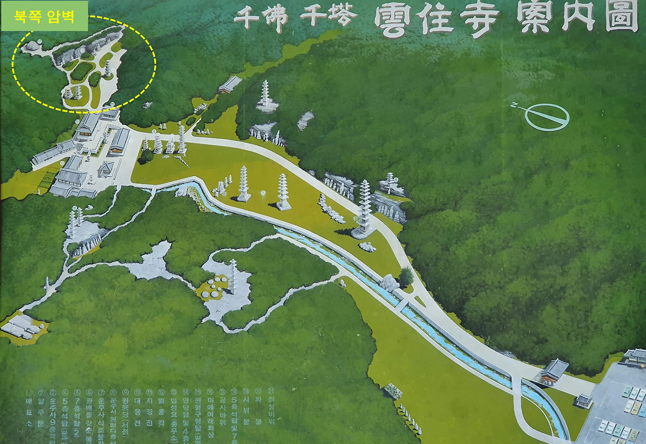 <사진 1> 운주사 천불천탑 안내도: 고려 초에 건립된 운주사는 현재 주차장 부근 서쪽 골짜기에 있었다. 14c 초에 건립된 천불천탑은 아미타불의 극락정토를 지상에 구현한 것이다.