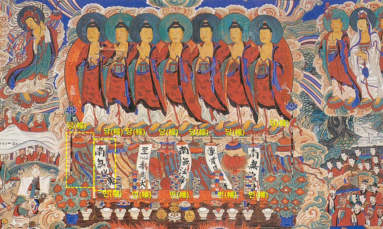 당(幢)과 번(幡)의 차이점은 아래 <사진 7>에 보인 양산 통도사 감로탱화에 잘 표현되어 있다. 감로탱화는 부처님의 수제자인 목건련이 아귀도에서 거꾸로 매달리는 고통을 겪는 어머니를 그 수난으로부터 구제하여 극락에 왕생케 했다는 〈불설우란분경(佛說盂蘭盆經)〉의 내용을 기본 바탕으로 하고 있다.