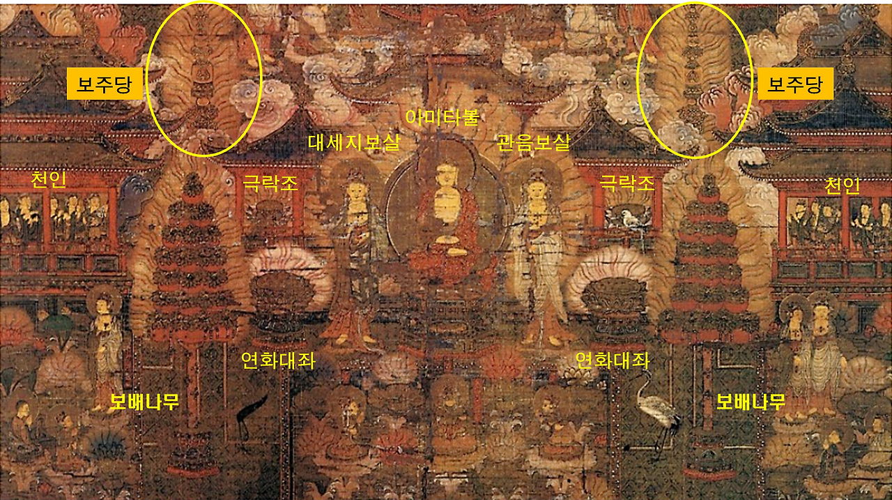 아미타삼존이 좌정한 극락 궁전의 좌우에는 극락을 장엄하는 장식물(보주당, 보배나무)이 각 1기씩 세워져 있다. 이를 보다 잘 표현한 (일본) 인송사 소장 고려 <관경16관변상도>를 아래 <사진 6>에 보였다.