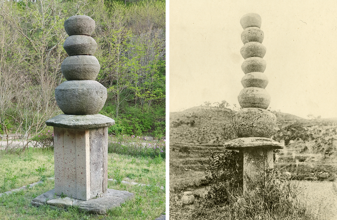 <사진 3> 발형다층석탑: (왼쪽) 현재 4층만 남았지만, (오른쪽) 원래는 7층석탑이었다. (조선고적도보, 6권, 1917)