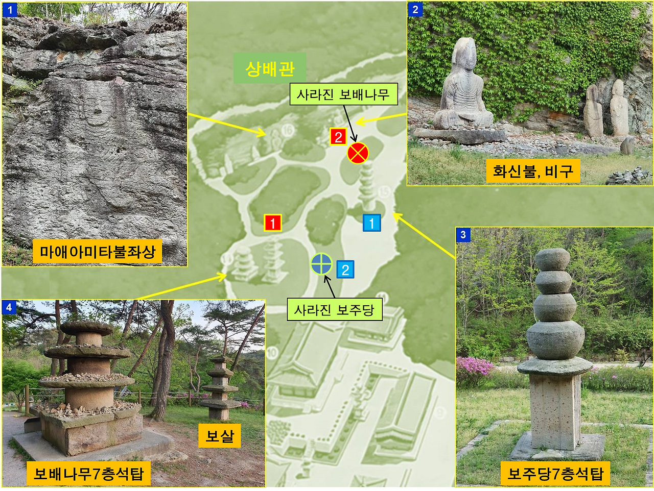 <관경16관변상도>는 아미타불의 극락(상배관, 중배관, 하배관)을 그림으로 표현한 것으로, 아미타불 + 극락 궁전을 중심에 두고 완벽한 좌우대칭 구도를 갖는 것을 특징으로 하는 종교화이다. 2차원 <관경16관변상도>를 설계도 삼아서 운주골 대자연에 구현한 것이 천불천탑이므로, 상배관 극락에 배치된 극락조형물(보주당, 보배나무)은 짝수개여야 한다. 즉, 7층보주당 및 7층보배나무는 마애아미타불을 중심에 두고 좌우에 각 1기씩 놓여있어야 한다.