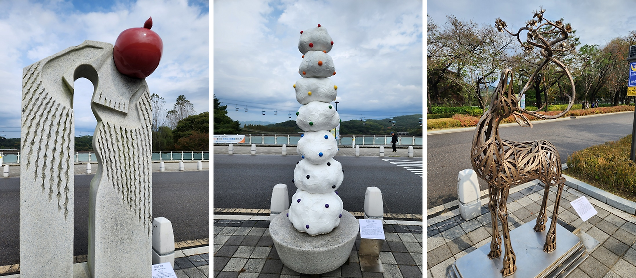 사진 2. 대공원 정문 방향으로 가다 보면 미리내 다리에서 만나는 조형물들; (왼쪽) 아담과 이브 (스테인리스 스틸, 화강석), (가운데) 꿈꾸는 구름 (오른쪽) 연리지와 매화와 사슴 (스테인리스 스틸)
