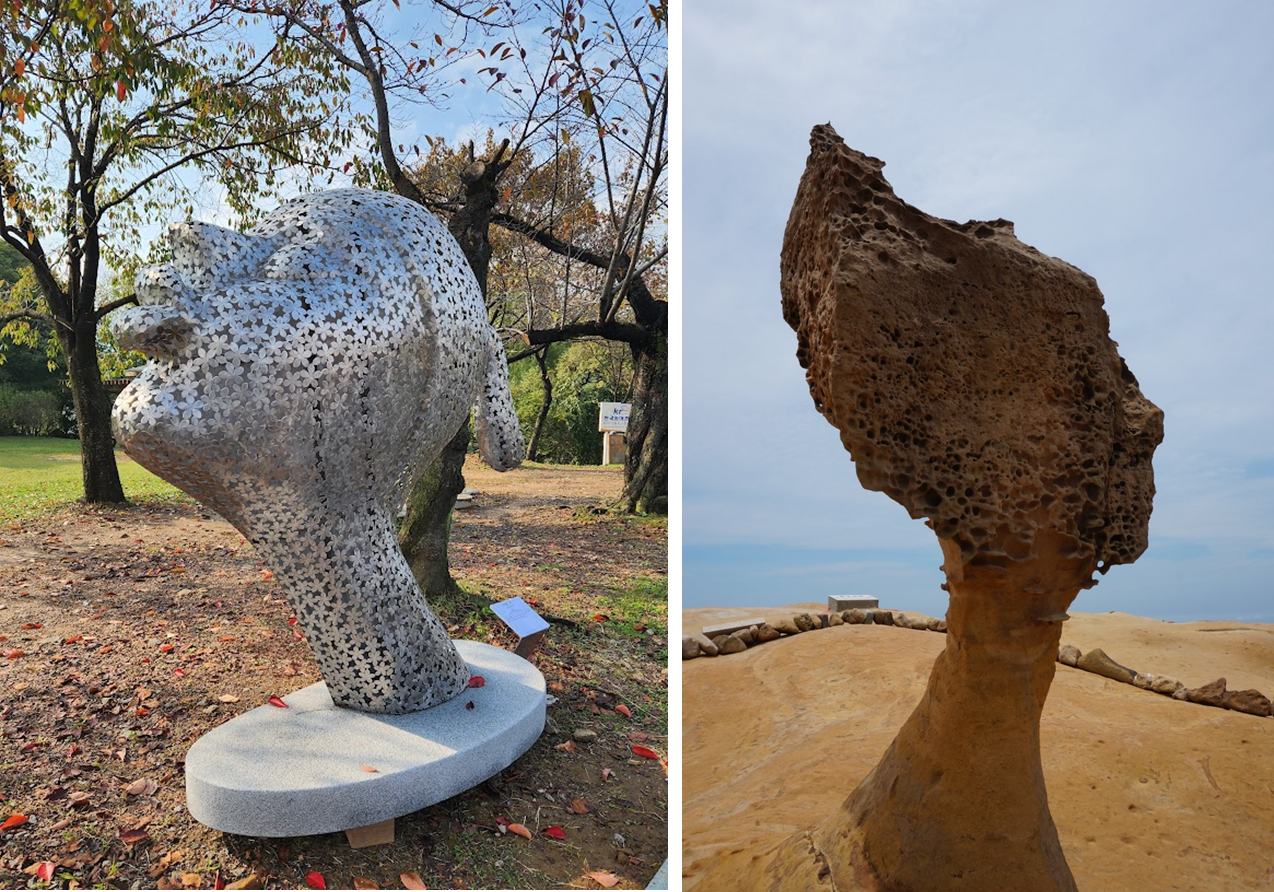 사진 3. (왼쪽) 과천 서울랜드 맞은편에 설치된 조형물: 야후, (오른쪽) 대만 예류지질공원의 자연 조형물: 클레오파트라