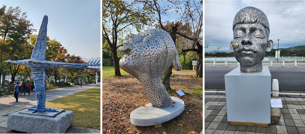 사진 1. (왼쪽) 지하철 4호선 대공원역 입구에 세워진 조형물: 새 (가운데) 서울랜드 앞에 설치된 스테인리스 조형물: 야후 (오른쪽) 대공원 가는 길 다리 위에 세워진 스테인리스 조형물: 나를 보다