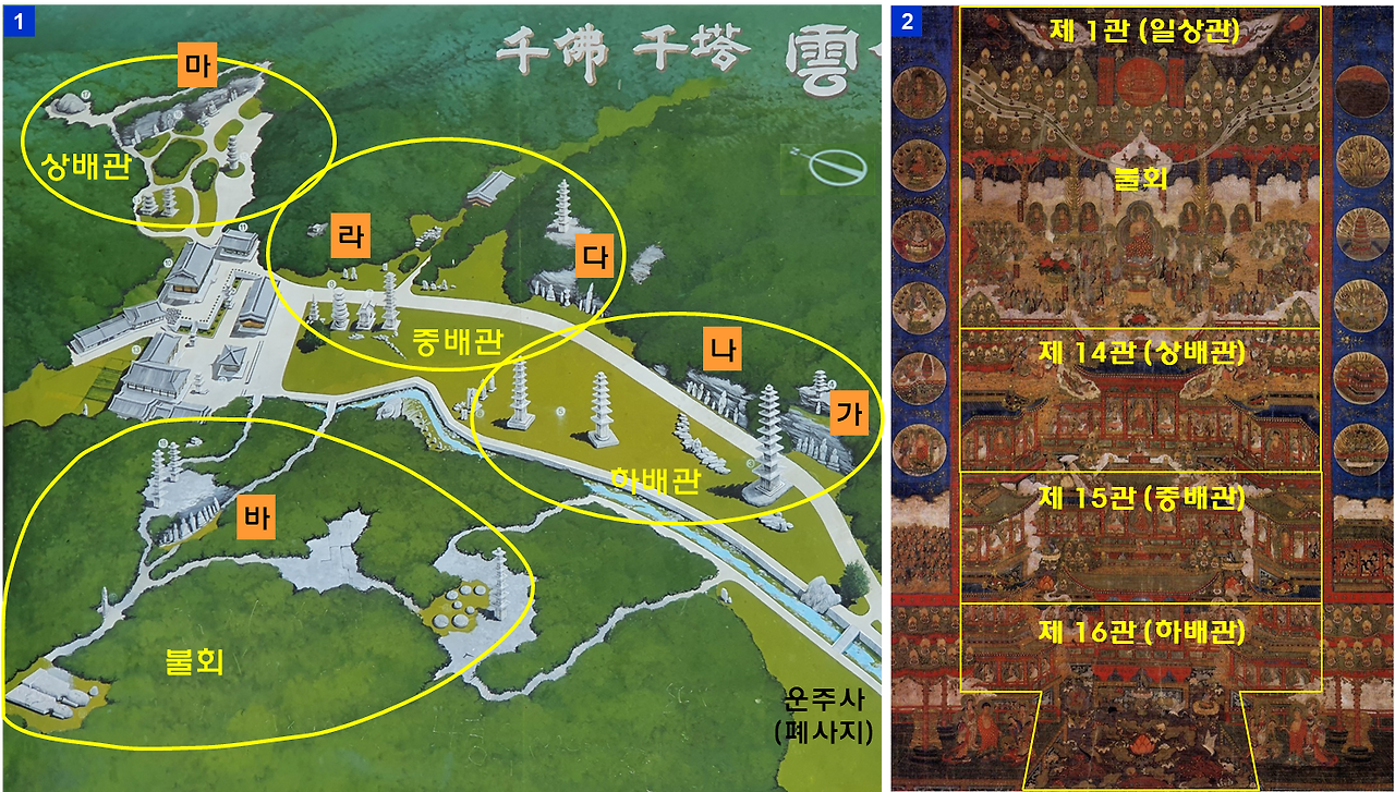 나의 연구에 의하면, 천불천탑은 고려 <관경16관변상도>를 설계도 삼아서 다탑봉 계곡과 산허리에 조성된 3차원 <관경16관변상도>, 즉 아미타불의 극락정토(Pure Land of Paradise)였다. 불심이 깊은 고려인은 14세기 초(고려 후기)에 남북 길이: 500 m×동서 폭: 200m로 이루어진 10만㎡(3만 평) 면적에 아미타불의 극락정토를 조성하였다. 조성된 천불천탑은 아래 <사진 2>의 오른쪽 그림처럼, 일본 서복사에 있는 고려 <관경16관변상도>와 똑같이 네 개의 정토(불회, 상배관, 중배관, 하배관)로 구획할 수 있다. 이것은 천불천탑이 서복사장 고려<관경16관변상도>를 일종의 설계도 삼아서 조성됐기 때문이다.