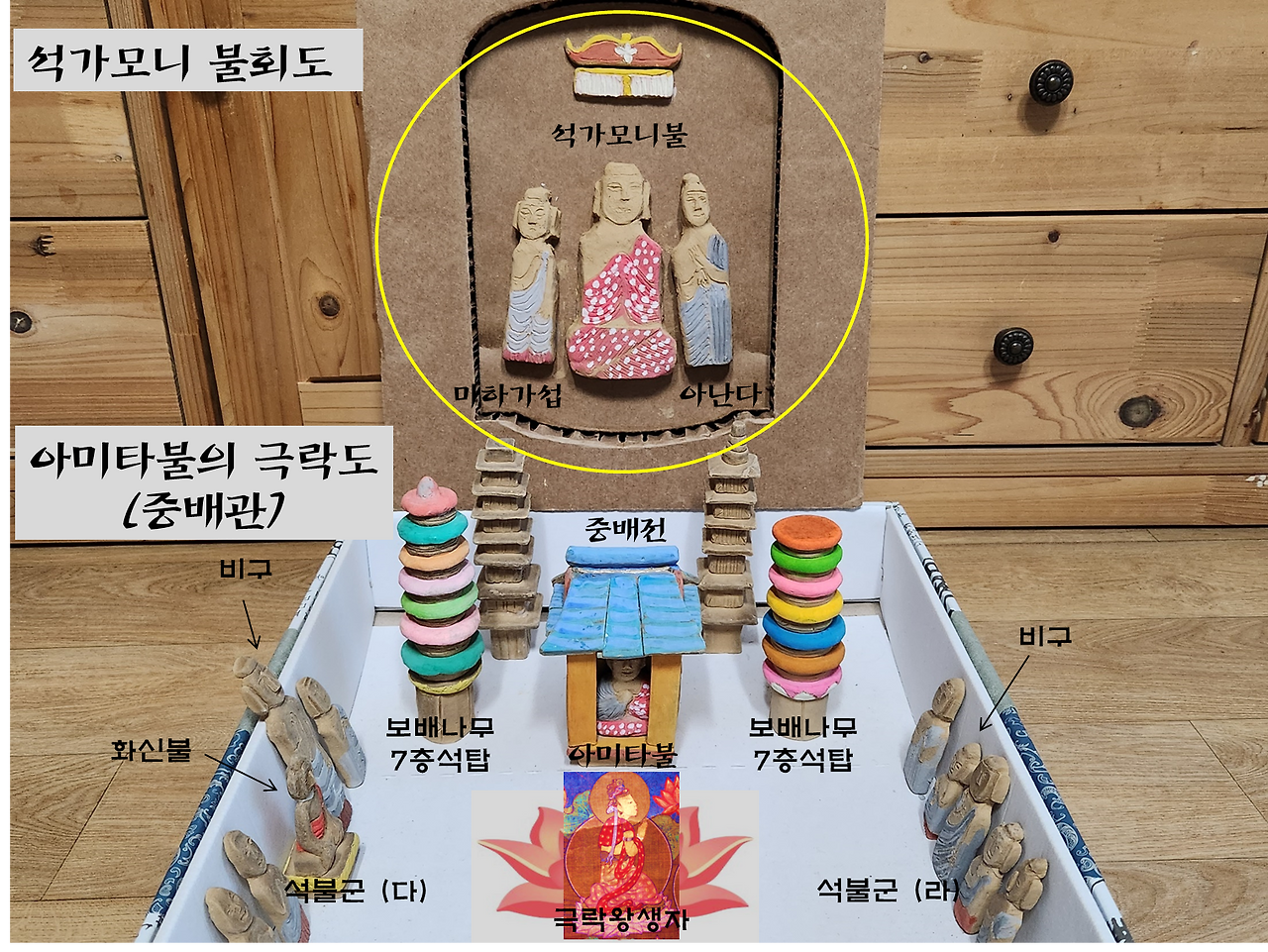 즉, 운주사 천불천탑 공간의 한가운데를 차지한 석조불감(쌍배불상)은, 임종 후에 극락에 온 중품왕생자를 맞이하기 위해 아미타불이 나투는 중배전(일종의 접견실)을 표현한 것이다. (참고: 아래 <사진 3>에 보인 고려 <관경16관변상도>는 일본 인송사에 보관 중인 변상도이다. 설명을 쉽게 하기 위해 서복사가 아닌 인송사에 보관 중인 고려 <관경16관변상도>를 보였다. 제작시기는 1323년이다.)