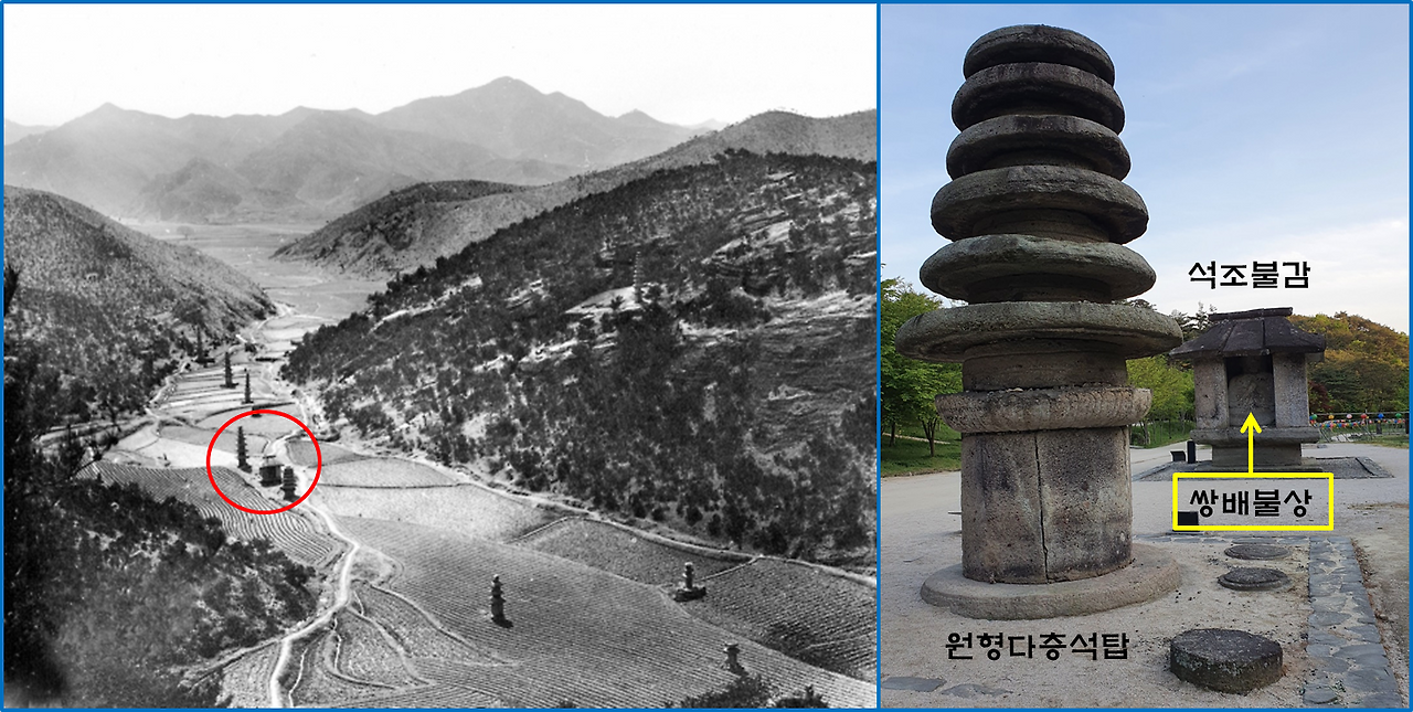 사진 1. (왼쪽) 운주사 천불천탑 공간에서 붉은색 동그라미 친 곳이 (오른쪽) 석조불감 및 원형다층석탑 공간이다. 이것의 상징성과 용도는 무엇일까?