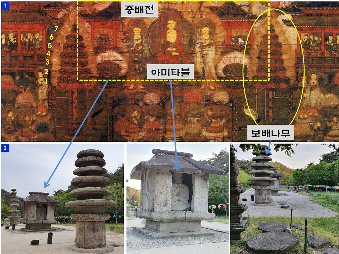사진 3. 천불천탑 공간의 칠층석탑-석조불감-원형다층석탑 공간은 고려 관경16관변상도의 중배관 영역이다. 원형다층석탑은 아미타극락을 장엄하는 보배나무를 석탑양식으로 만든 것이다.