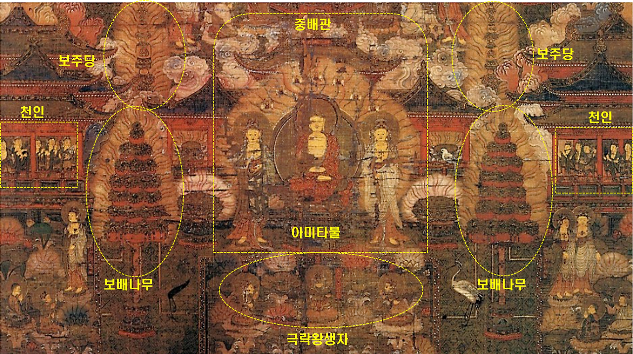 <사진 3> 고려 <관경16관변상도> : 아미타불이 극락왕생자를 맞이하기 위해 협시보살과 함께 극락전에 나투셨다. 극락장엄물인 보주당과 보배나무가 극락전 좌우에 세워져 있다.