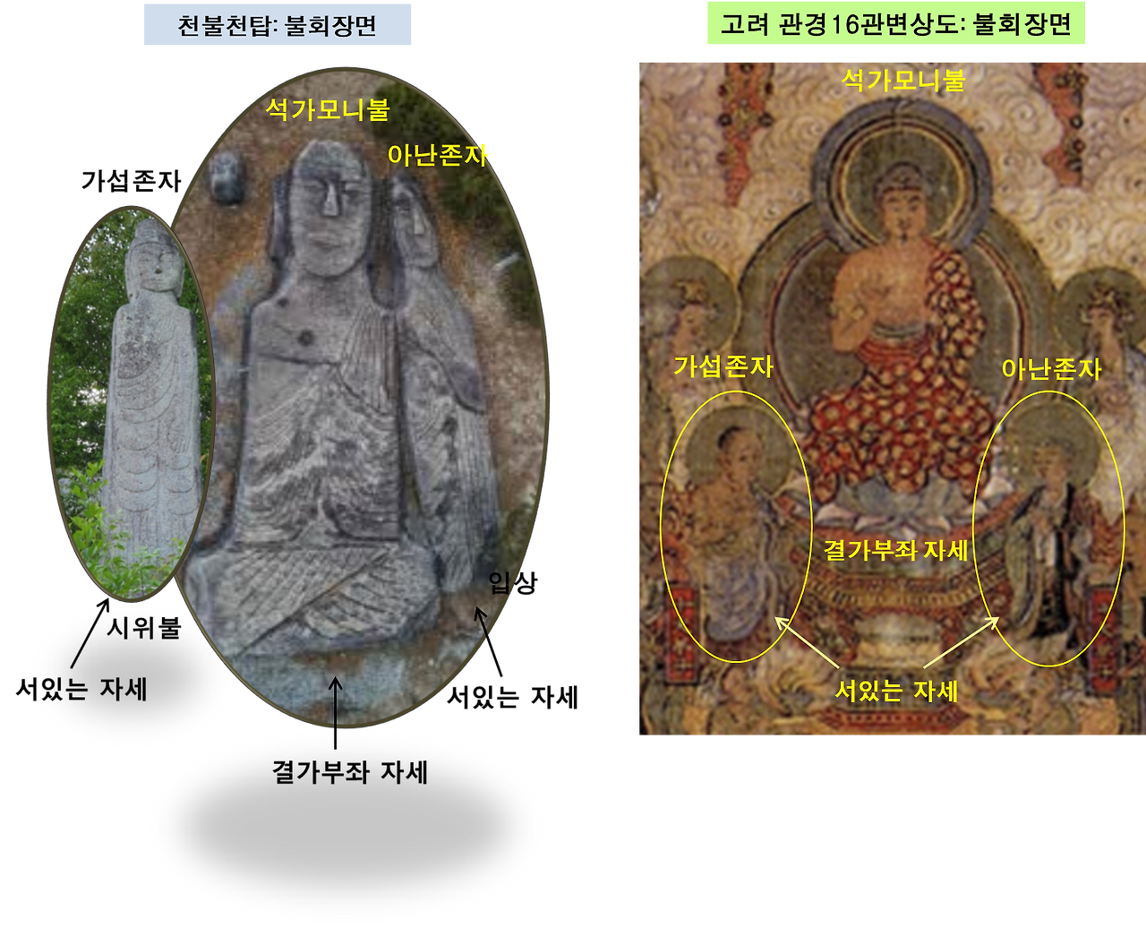아래에 보인 <사진 1>은 (1300-1320년 사이에 그렸을 것으로 추정되는) 고려 <관경16관변상도>와 천불천탑의 상관관계를 보인 것이다. 일본 서복사에서 보관 중인 고려 <관경16관변상도>를 살펴보면, 크게 4개의 정토로 구획되어 있다. 그림의 맨 위에는 일상관 바로 아래 석가모니불의 영산정토(불회)를 그려 넣었고, 그 바로 아래에는 아미타불의 구품 극락정토(제14:상배관, 제15:중배관, 제16:하배관)를 그려 넣었다. 즉, 서복사장 고려 <관경16관변상도>를 운주골에 그대로 재현해 놓은 것이 바로 천불천탑이다.