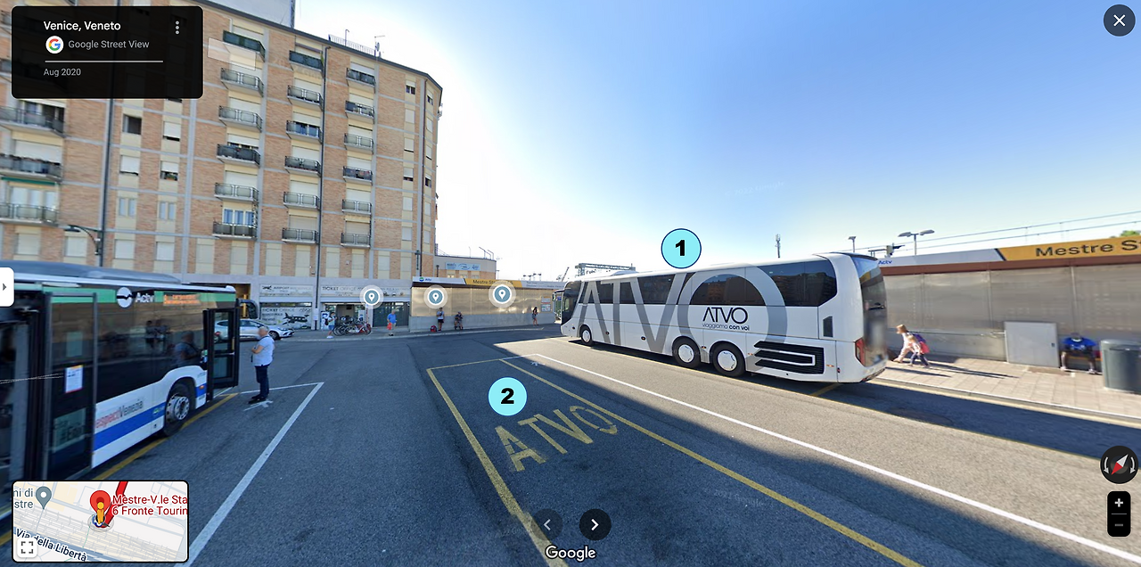 메스트레 버스정류장은 아래 구글사진과 같았다. 여기서 ATVO 버스를 타면 베네치아 마르코폴로 공항까지 가는데 18분 정도 걸린다. 우리는 3시간 여유를 갖고 버스정류장에 도착했기에 제법 마음의 여유가 있었다. 땡볕이 따갑게 내리쬐는 7월의 버스정류장은 여행객들로 가득 찼다. 얼핏 사람들이 줄을 선 것 같기도 했지만, ATVO 버스가 도착하면 기존의 줄은 온데간데없이 사라지고 출입문을 향해 사람들이 우르르 몰려들었다. 베네치아는 워낙 유명 관광지인지라 세계 각지에서 다양한 인종이 몰려들다 보니 공중질서가 끝까지 유지되는 경우는 드물었다. 다들 적당히 눈치 보고 적당히 알아서 행동하곤 했다.