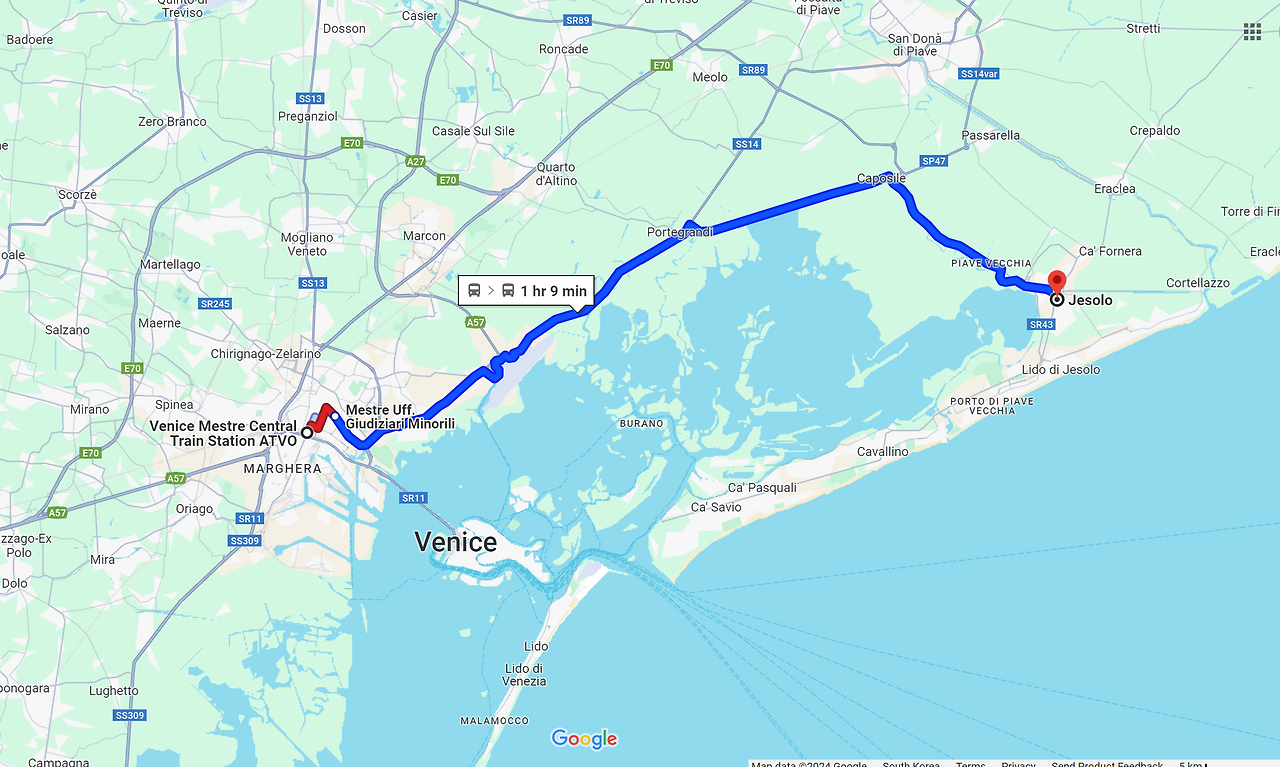문득 베네치아 공항을 지나친 것 같다는 생각이 들어 옆좌석에 앉은 이태리 젊은 친구 (중.고등학생 나이로 보였다)에게 '이 버스가 베네치아 공항으로 가느냐?"라고 물었다. 그 친구 왈, "아닌데요." 하는 것이었다. 나는 내가 잘못 물었나 싶어 재차 물었더니 역시 아니라고 말하는 것이었다. 순간 버스를 잘못 탔다는 것을 깨닫고 낭패감에 휩싸였다. 나는 깊은 잠에 빠진 아내를 흔들어 깨우고 버스를 잘못 탄 것 같다고 알려줬다. 아내도 깜짝 놀라면서 내 얼굴을 쳐다보는 것이었다. 어떻게 해야 할지 정말 난감했다. 베네치아 메스트레 버스 정류장에는 2종류의 ATVO 버스가 있는 것 같다. 하나는 도착지가 베네치아 공항이고, 또 하나는 이름 모를 곳으로 향하였다. (나중에 알게 되었는데, 메스트레 버스 정류장에서 2번 주차 위치에 선 ATVO 버스의 목적지는 Jesolo (이태리어로 에소로, 또는 에솔로, 영어로 제소로, 제솔로)라는 유명한 비치였다.)