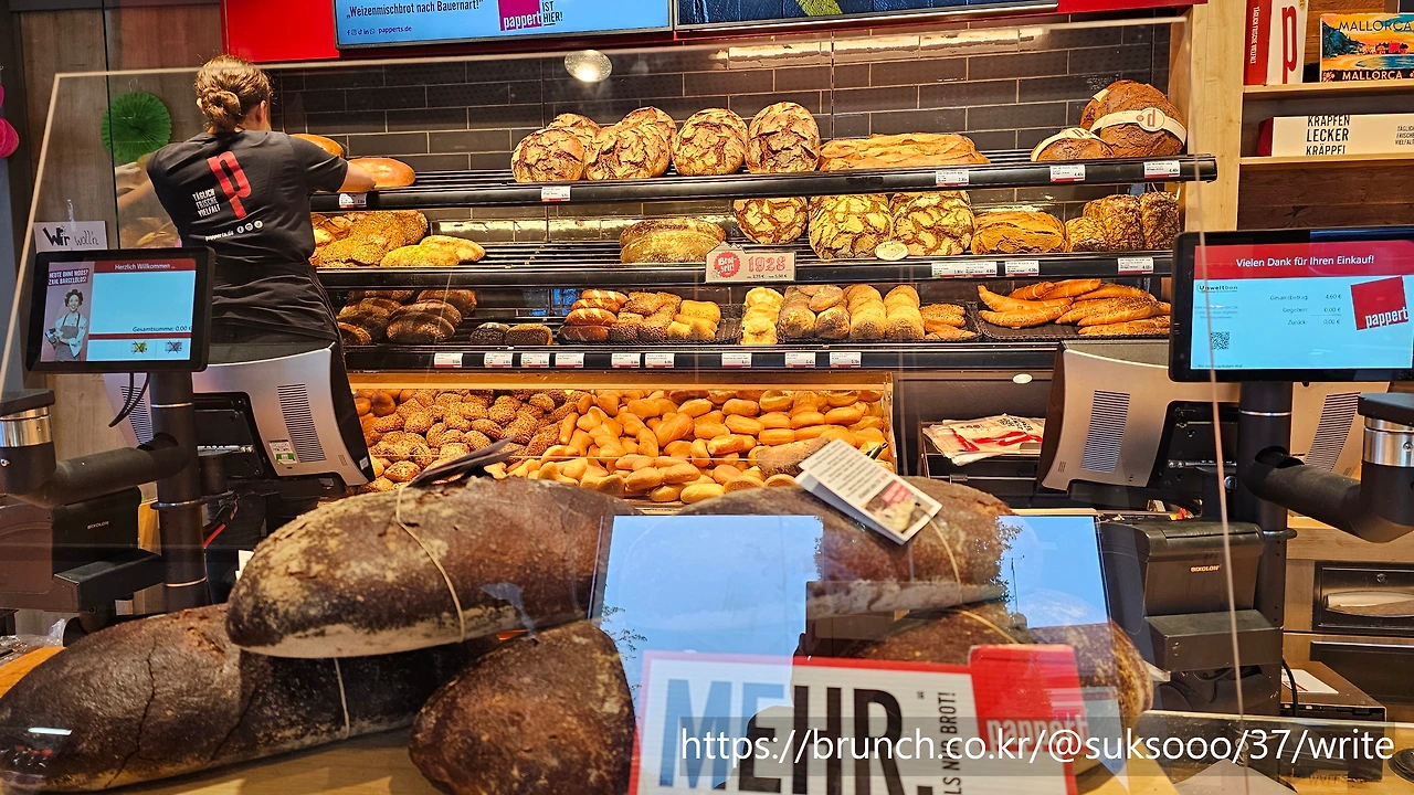 빵 진열대 앞에 쓰인 "Mehr als nur Brot” (단지 빵 이상)라는 슬로건에 눈길이 머문다.