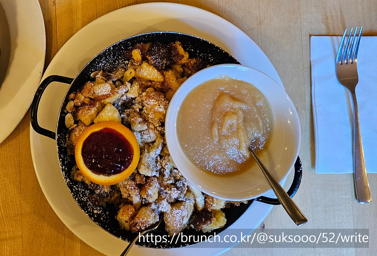 제가 정신줄 놓고 내일이 없는 듯 열심히 먹어치운 이 카이저슈마른은요. 오스트리아와 독일의 바이에른 주에서 주로 즐기는 팬케이크입니다. 잘게 찢어진 반죽을 버터에 다시 굽듯이 볶고, 설탕을 살짝 넣어 표면을 캐러멜 화한 후에 마지막에 슈가 파우더를 뿌립니다. 여기에 사과소스나 과일 콤포트를 곁들입니다.