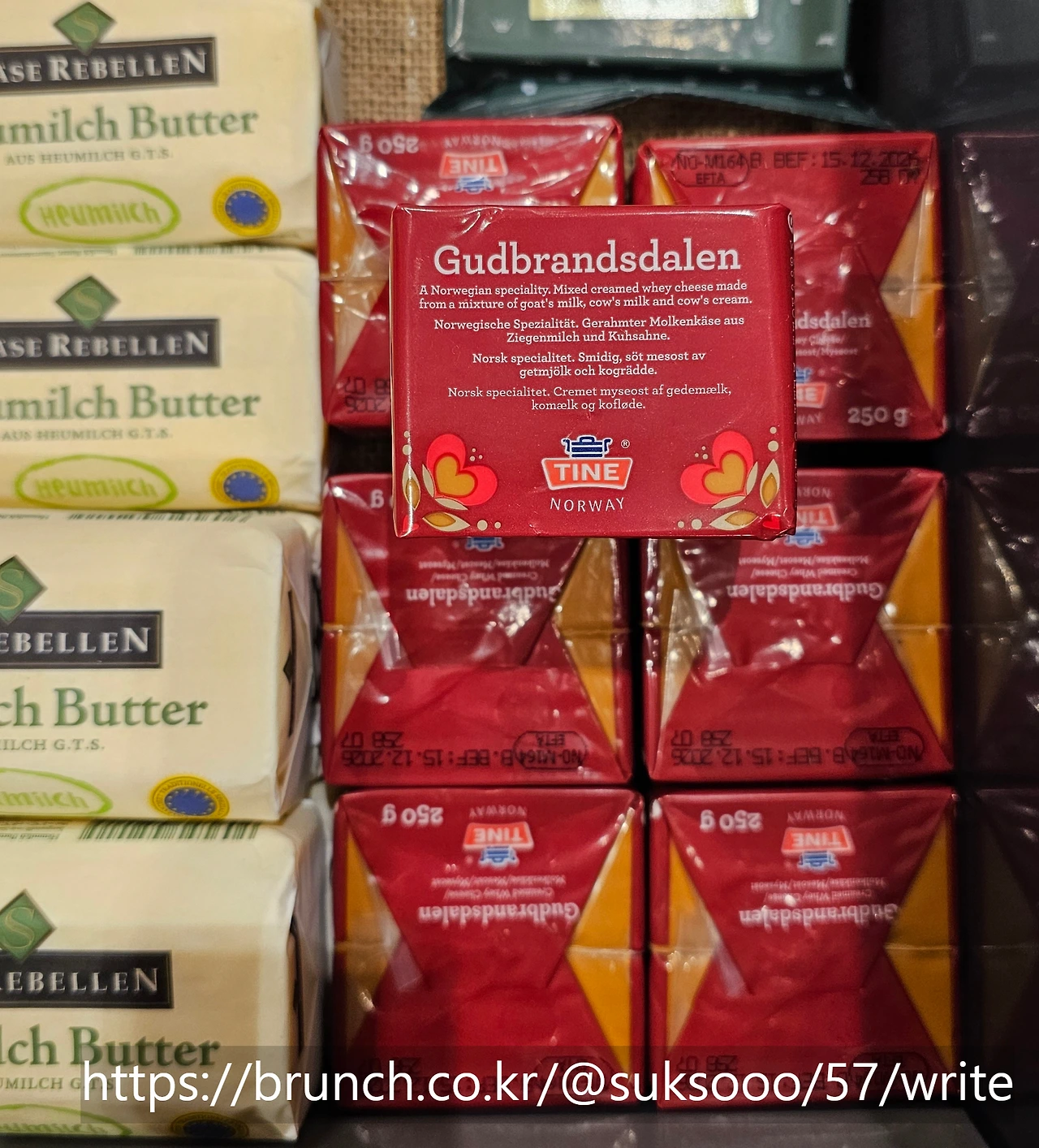 독일을 포함한 유럽은 확실히 치즈와 소시지, 햄류가 주된 식재료입니다. 주식인 빵과 함께 먹기 때문에 빵에 최적화가 되어 있다는 생각이 들 정도고 맛, 향, 질감 모두 그렇더라고요. 하지만 저는 먹는 것만 사 먹고요. 다른 것은 그다지 도전을 못 하고 있었습니다. 막상 궁금해서 사고는 몇 번 먹고 버려지기 일쑤였기 때문에 안전한 치즈나 햄, 소시지만 사 먹었더랬죠. 그러던 중 되게 낯선 치즈를 발견했습니다. 자세히 보니 브라운치즈라고 쓰여 있더라고요. 얼른 호기심에 사 왔습니다. 와~ 이 맛은 정말 솔티드캐러멜을 잇는 치즈계의 솔티드 캐러멜이었습니다. 첫맛은 음? 응? 뭐지? 반전의 맛입니다.