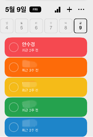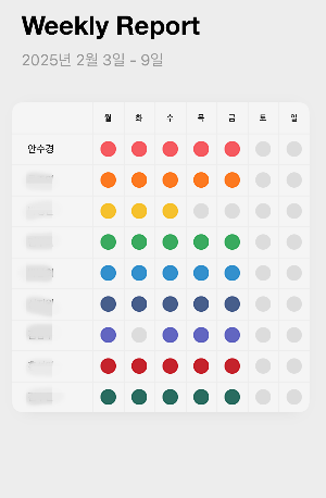 습관을 적는 칸에 멤버들 이름을 적는다. 멤버별로 색상을 다르게 설정한다. 그런 다음 미션을 수행한 멤버 이름 앞에 동그라미를 체크하면 끝이다.