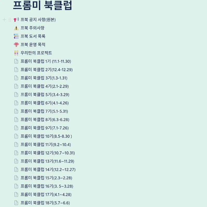 나는 처음부터 이런 것들을 기록하지 않고, 그냥 흘려보내는 것이 아깝다는 생각이 들었기에 노션을 활용하고 있다. 노션에 각 기수 별로 페이지를 만든 뒤, 토글이라는 기능을 활용하여 독서 모임 기수 별로 기록을 정리 정돈하고 있다.