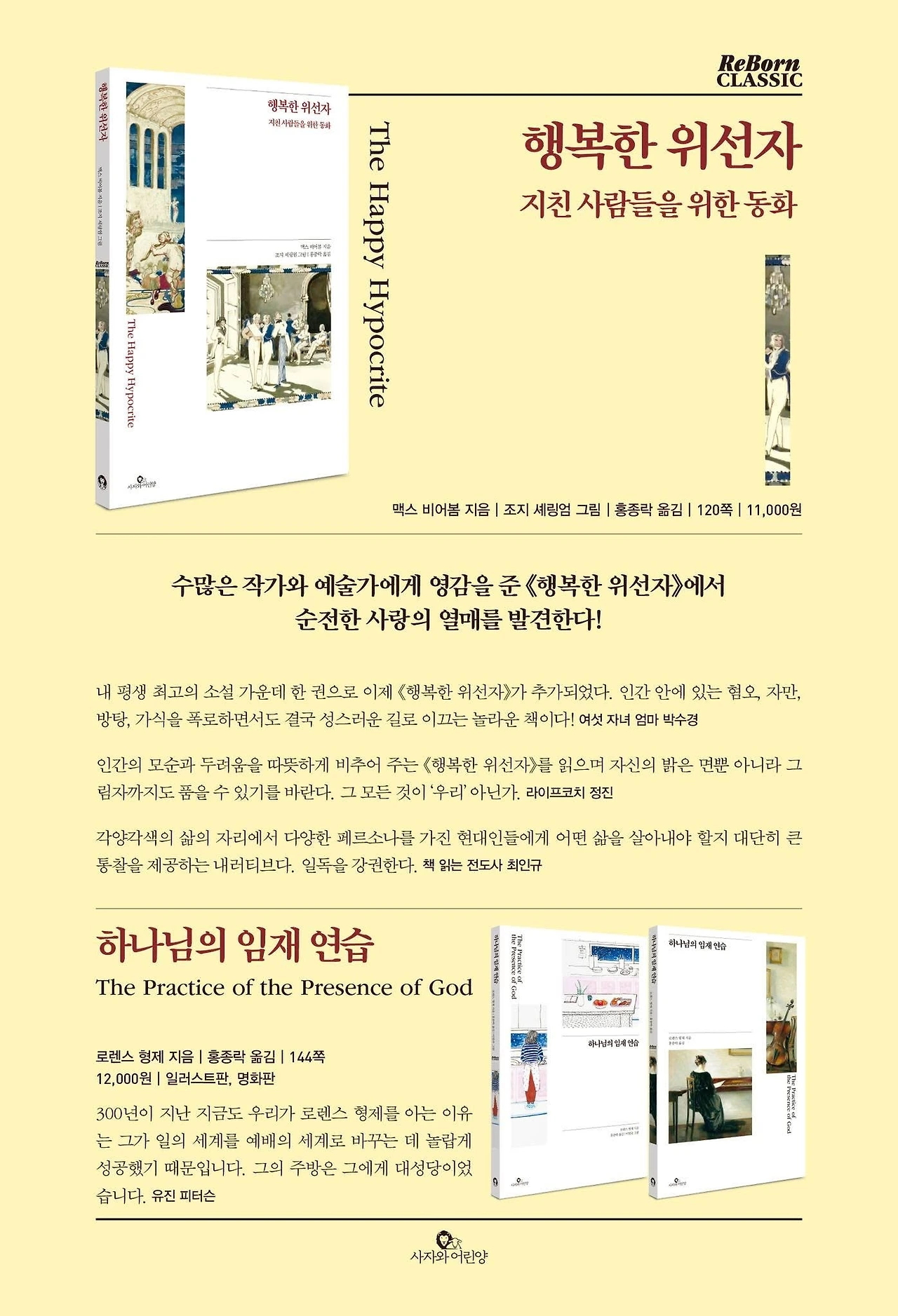 박수경 (여섯 자녀 엄마): 내 평생 최고의 소설을 꼽으라면 안톤 체호프의 《롯실드의 바이올린》, 레이먼드 카버의 《대성당》을 이야기했다. 그런데 이제 맥스 비어봄의 《행복한 위선자》가 추가되었다. 오페라를 한 편 감상한 듯 시작부터 끝까지 긴장을 늦출 수 없는 작품이다. 사랑이 무엇이기에 이토록 모든 걸 바꿀 수 있는 걸까. 순전한 사랑이 길을 잃은 현시대를 향해 죽기 전 한 번쯤은 자신을 던져 사랑하자고 말을 건넨다. “지친 사람들을 위한 동화”라는 부제에서 읽히듯 이 책은 무미건조한 회색도시를 나와 산들바람 불고 꽃이 만발한 곳으로 우리를 안내한다. 인간 안에 있는 혐오, 자만, 방탕, 가식을 폭로하면서도 결국 성스러운 길로 이끄는 놀라운 책이다!