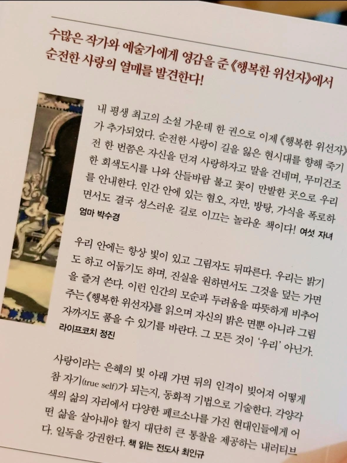 내 평생 최고의 소설 가운데 한 권으로 이제 《행복한 위선자》가 추가되었다. 순전한 사랑이 길을 잃은 현시대를 향해 죽기 전 한 번쯤은 자신을 던져 사랑하자고 말을 건네며, 무미건조한 회색도시를 나와 산들바람 불고 꽃이 만발한 곳으로 우리를 안내한다. 인간 안에 있는 혐오, 자만, 방탕, 가식을 폭로하 면서도 결국 성스러운 길로 이끄는 놀라운 책이다!