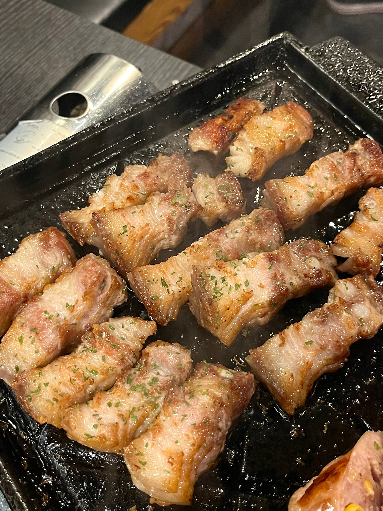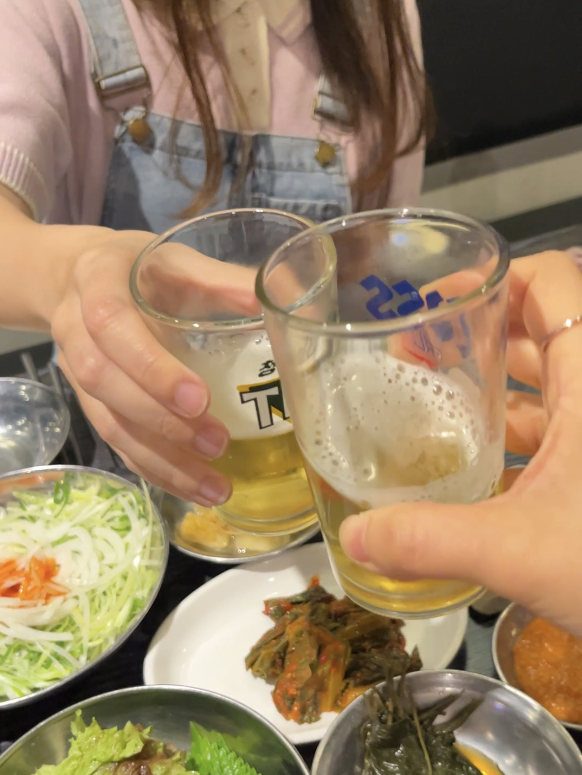 그다음 코스는 우리가 기다리고 기다리던 대망의 저녁식사 시간이다. 그리고 저녁을 먹으러 걸어가는 길에는 벚꽃이 예쁘게 핀 거리를 거쳐가는 깨알 코스까지 넣어놨다. 저녁 먹으러 간 삼겹살집에 자리 잡고 앉자마자 일단 소맥으로 ‘갈증’을 풀어줬다. 여기서의 갈증은 정말 오래 걸어서 목이 마르기도 했고, 또 윤지님과 내가 목말라하던 '이 시간에 대한 갈증'이기도 하다.
