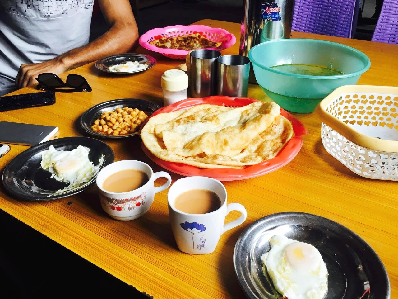 벡은 아침을 같이 먹자며 자신이 메뉴를 추천해주겠다고 했다. 나와 언니는 이런 그의 배려와 관심이 고맙기도 했지만 한편으로는 '왜 이렇게 잘해주는 거지?'라며 이해가 안 가기도 했다. 여행 중 대부분 이런 호의의 결말은 뒷목 잡게 하는 반전을 줬기 때문에. 그러나 막상 벡의 미소를 보니 거절이 쉽사리 되지 않았다. 함께 간단히 달걀 프라이와 짜파티(인도의 '난'과 비슷한 빵) 그리고 짜이를 먹었다. 식사를 모두 마치고 벡은 긴 다리로 성큼성큼 계산하는 곳으로 걸어다더니 우리가 먹은 음식까지 계산을 하려고 했다. 우리는 지갑에서 지폐를 꺼내려는 벡에게 달려갔다.