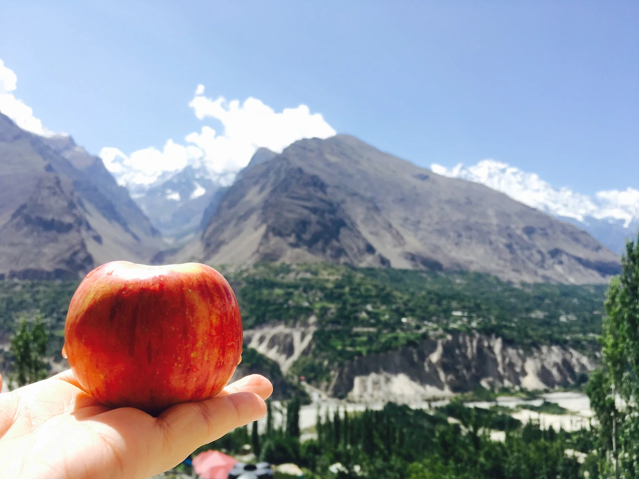 맞다. 더 자고 싶었는데 배가 고파서 깬 '나'라는 사람이다. 어제 훈자에 들어오기 전 알리아바드 시내에서 훈자 가는 지프차를 구하는 와중에 우리는 그 맛있다는, 그 유명한 '훈자 사과'를 사 왔었다. 눈곱도 때지 않은 채 퉁퉁 부은 얼굴로 사과를 봉지에서 꺼내 대충 물에 헹궈 티셔츠에 슥슥 닦아냈다. 왠지 훈자에서 먹는 '훈자 사과'는 훈자의 바깥 풍경을 보며 먹고 싶었다. 우리 방문을 활짝 열고 화창한 햇살에 오늘은 더욱 선명히 보이는 설산을 보며 아담한 사이즈의 사과를 한입 크게 베어 물었다. '역시는 역시'라는 말이 괜한 말이 아니었다. 씹으면 씹을수록 달달한 물이 쭉쭉 나오는 사과를 입에 한가득 넣고 눈 앞에 펼쳐진 설산을 바라보니 혼잣말이 절로 나왔다.