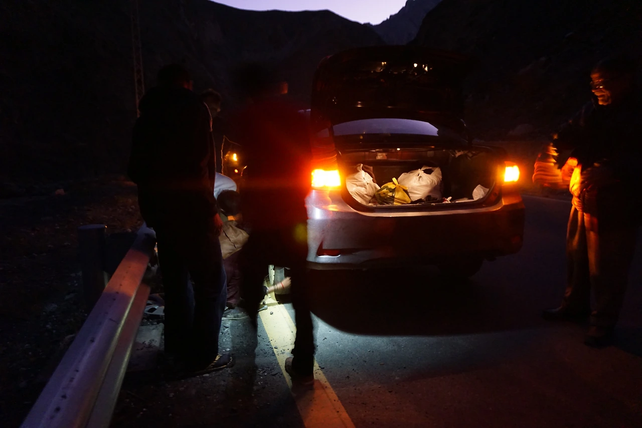 유쾌하게 우리 모두는 중국과의 국경인 쿤제랍 패스까지 구경을 하고 다시 훈자 마을로 돌아가고 있었다. 때는 9월, 훈자의 가을이 찾아오고 있을 시기여서 해는 생각보다 빨리 떨어지고 있었다. 도로는 포장이 잘 되어있었지만 높은 산맥들 사이를 구불구불 곡선을 타며 조심히 운전을 해야 하는 길이었다. 우리의 대화 소리만 가득하던 차 안에 갑자기 '퍽-'하고 뭔가 터지는 소리가 났다. 갓길에 일단 차를 세우고 우리 모두는 차에서 내렸다. 차 여기저기를 살피던 할아버지께서 타이어가 펑크가 났다고 하셨다. 다행히도 스페어타이어가 있다며 갈아만 끼우면 되니 너무 걱정하지 말라고 우리를 안심시켜주셨다. 그런데 타이어 교체 중에 한 부품이 어디론가 빠졌고, 주변은 어두워서 그 부품이 보이지 않았다. 언니와 나까지 우리 모두 그 부품을 도로 여기저기 찾아 해메였다. 그래도 다행히 할아버지께서 작은 부품을 찾으셨고 다시 타이어 교체를 시작하셨다. 이미 차 밖으로 나온지는 시간이 꽤 지났고, 고도가 높은 지역이라 점점 날은 추워지고 있었다. 언니와 나는 '우리 오늘 숙소로 무사히 잘 들어갈 수 있을까..'걱정을 하고 있었다. 그때 어느 차 한 대가 우리 바로 뒤에 깜빡이를 켜고 정차를 하더니 운전자가 바로 내려 할아버지에게 다가가 무엇인가를 물어보는 듯했다. 그 둘은 너무 친근하게 이야기하길래 이미 알고 있는 사이인가 싶었다. 그러고 그 차에 타 있던 젊은 청년 4명 모두 우르르 내리더니 타이어 교체하는 곳으로 갔다. 그리고 단 10분 만에 타이어를 갈아줬다. 그들은 예의 바르게 할아버지들께 인사를 깍듯하게 하고 바로 차에 타서는 시끄러운 음악을 다시 틀고는 쌩-하고 출발했다.