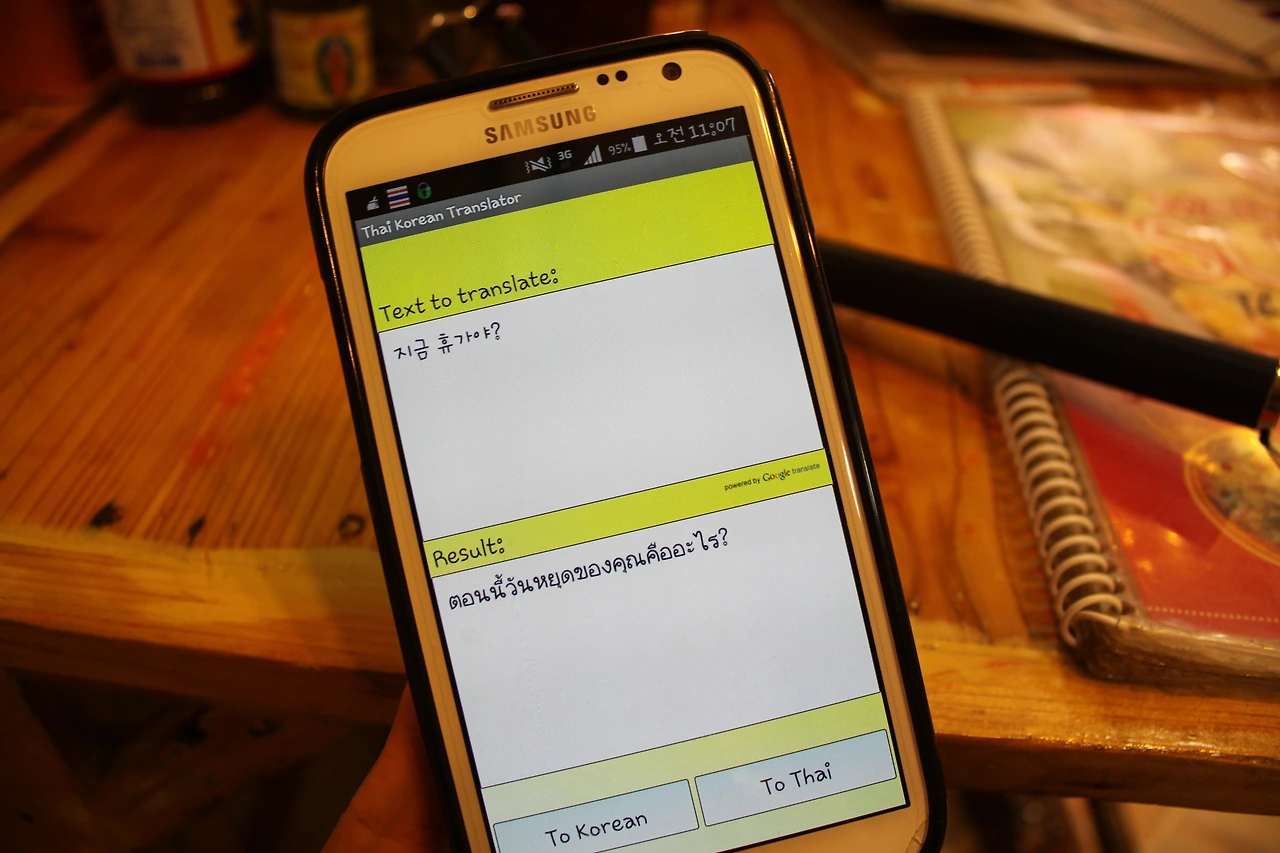 단지 몇 마디의 한국어와 영어 단어. 그리고 스마트폰 번역기.