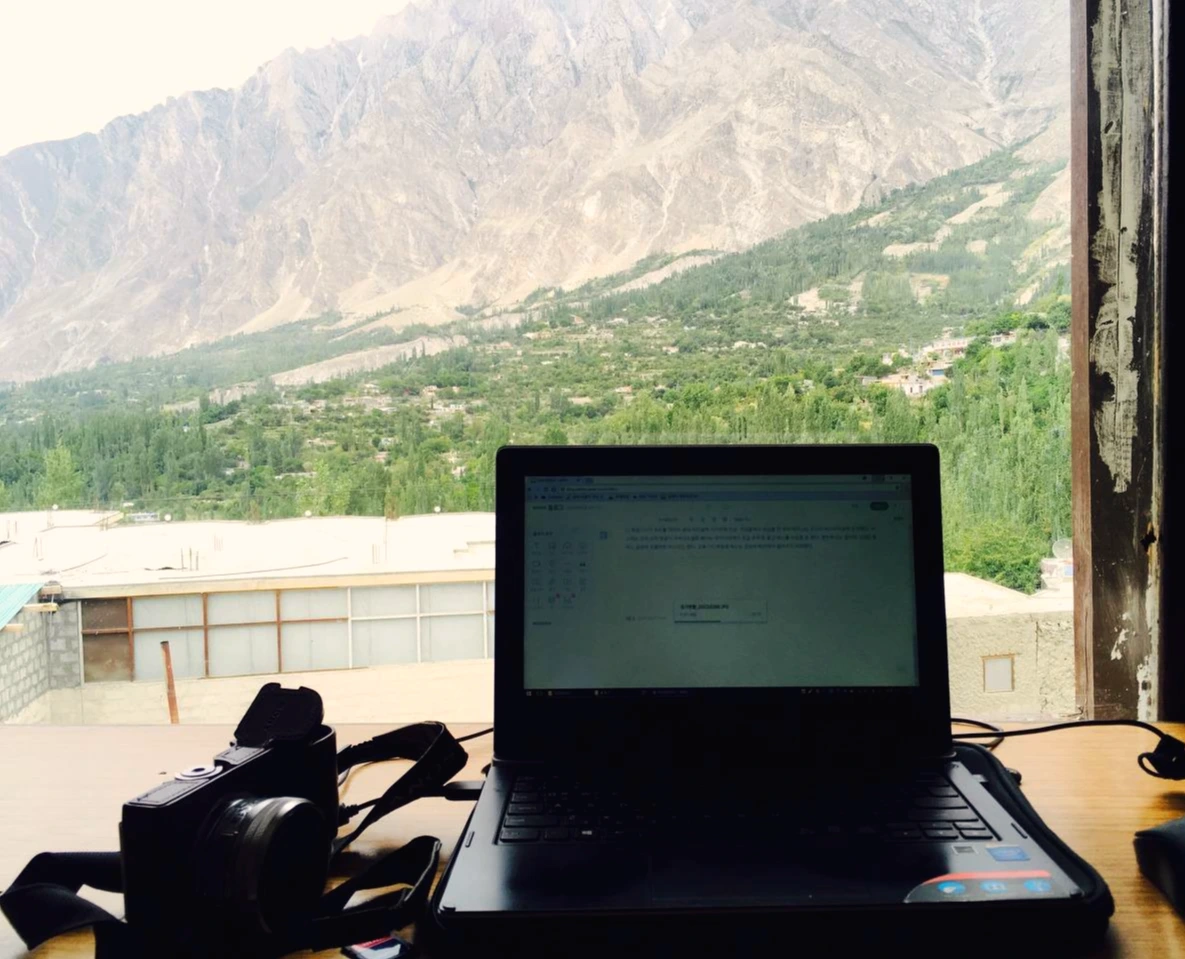 그렇게 오늘도 차가워진 코를 한 손으로 감싸 안고 이른 아침에 눈을 떴다. 우리 방은 숙소의 리셉션과 꽤 멀리 떨어져 있어서 와이파이가 잡히지 않지만 이제는 익숙하게 와이파이가 되지 않는 휴대폰으로 잘도 논다. 옆 침대에 자고 있는 H언니는 일어날 기미가 보이지 않아 오늘은 조용히 먼저 활동을 개시해본다. 익숙해진 회색빛 찬 물에 머리를 감고 부지런을 떨어 손빨래까지 마쳤다. 혼자 숙소 주변을 산책하고 돌아오니 그제야 H언니는 일어났다. 우리의 오늘 계획은 '각자 할 일을 하며 휴식을 취하는 것'이었다. 인도에서 훈자에 오고 나서 숙소를 알아보느라, 파키스탄 할아버지들과 투어를 다니느라, 현지인 친구들과 함께 시간을 보내느라 우리끼리 차분하게 휴식을 취하 지를 못 했었다. 그리고 여행을 다니면서도 일을 하고 있는 H언니는 오늘은 꼭 인터넷을 써야 한다고 했다. 나도 여행 중에 블로그에 꾸준히 여행기를 연재하고 있었는데 북인도, 훈자를 여행하면서 열악한 인터넷 사정과 함께 포스팅이 뚝 끊긴 지 언 3주가 넘었다. 그래서 오늘은 H언니랑 같이 노트북을 들고 카페 드 훈자 (정전이 쉼 없이 나는 훈자에서 가장 큰 발전기를 돌리는 곳이라 신호는 약하지만 와이파이를 비교적 안정적으로 이용할 수 있다.)로 향하기로 했다.
