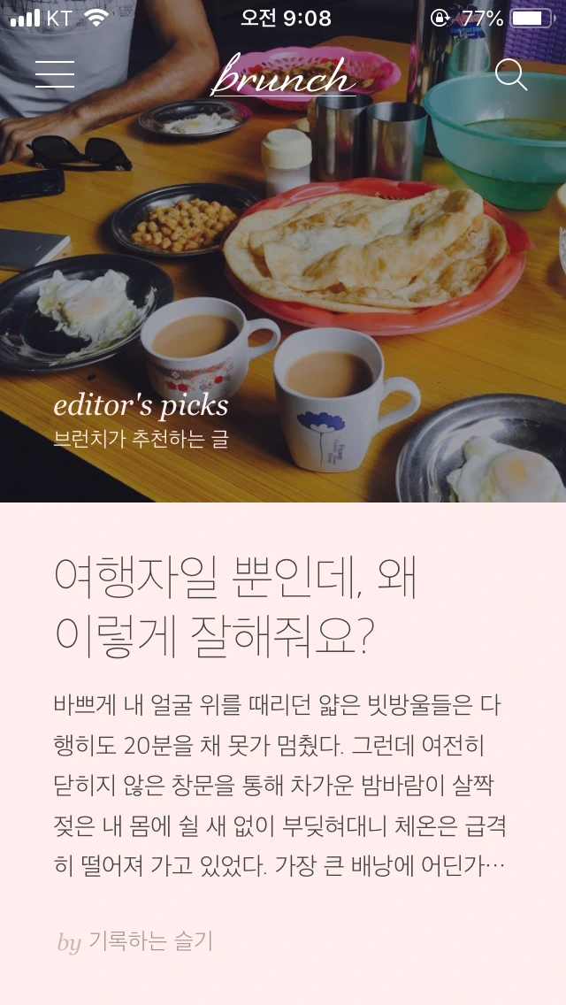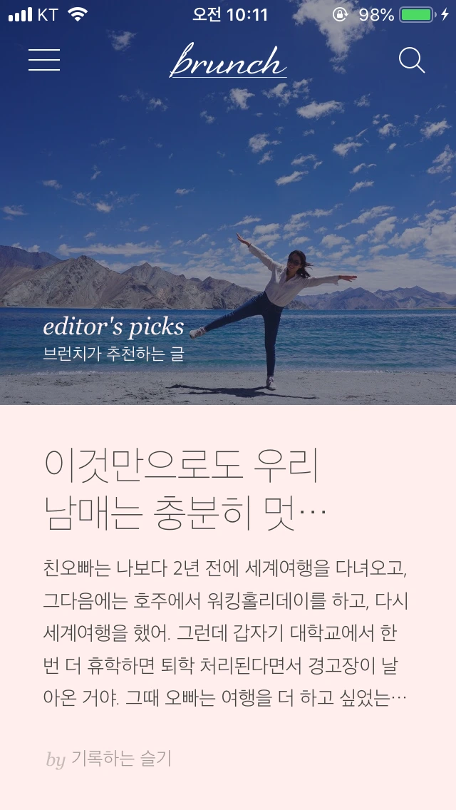 위에 언급했듯이 지금까지는 그렇다 할 큰 결과물을 만들지는 못했지만, 그렇다고 내게 아무 일이 일어나지 않았던 것은 아니다. 언제쯤 내 글이 저기 올라갈까 늘 꿈만 꾸던 '브런치 editor's pick 메인'자리에 내 글이 두 번이나 올라가 보기도 했고, 브런치 페이스북 페이지에도 내 글이 올라가는 영광을 맛보기도 했다. 그리고 심심치 않게 다음(daum) 사이트 '여행', '직장 인 IN' 메인으로 내 글이 올라가기도 했다. 7년 전부터 다른 사이트에서 블로그를 운영해왔지만 브런치는 '글 쓰는 사람'들이 모여있는 플랫폼이다 보니 내 글이 좋은 반응을 얻었을 때 오는 그 성취감과 짜릿함은 확연히 달랐다. 브런치에 글을 올리며 침체되어 있고, 어둡기만 했던 내 마음속이 금세 콩닥콩닥 뛰기 시작했고, 밝아졌다. 그리고 내 글에서도 심장 박동 소리가 느껴졌다.