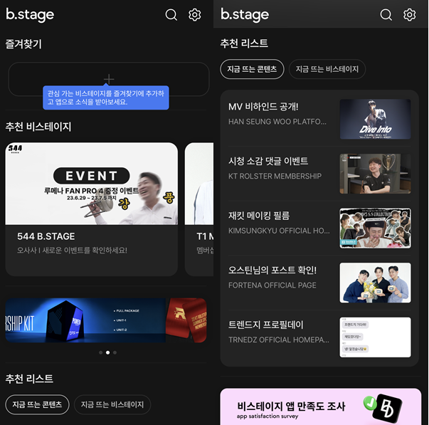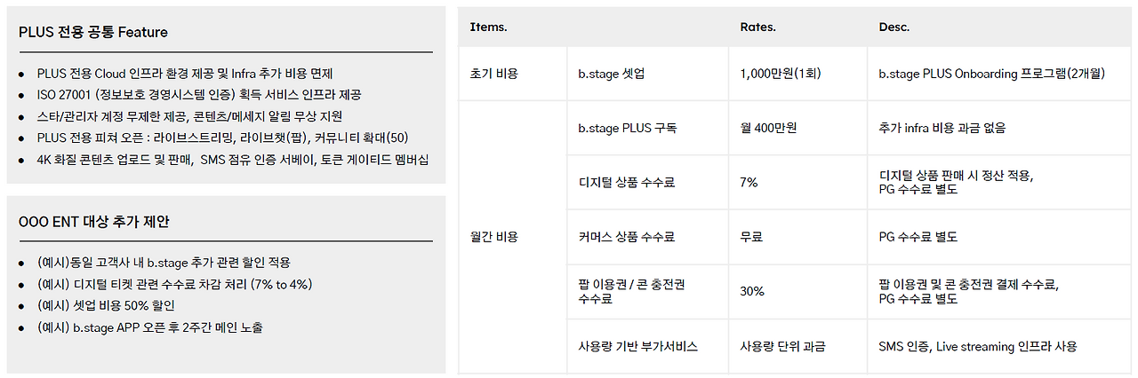 - 현재 B.Stage 앱내에서는 커머스의 기능이 큰 비중을 차지하고 있지는 않음 주된 요소가 컨텐츠와 커뮤니티 기능이며, 컨텐츠 또한 Youtube를 끌어오는 형태이기 때문에 앱자체의 리소스 비중이 크기 않아보임 - 커머스 영역이 커졌을 때, 단순히 아티스트 IP로 기반한 대형 엔터사의 경우 커머스 영역 만으로도 서버, DB 등의 운영이슈가 있기 때문에 해당 플랫폼에서도 커머스 영역이 커졌을 때 운영상의 이슈가 없을지 확인이 필요해 보임