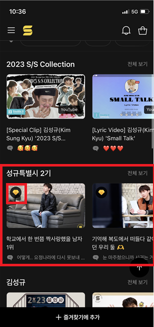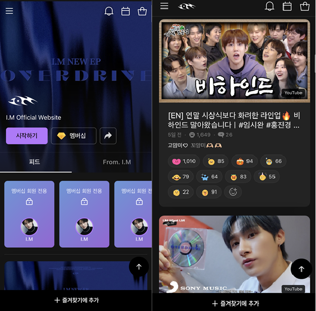 - 전체 아티스트와 관련된 컨텐츠를 아카이빙을 한다는 점은 해당 플랫폼에서만 유저가 활동을 해도 된다는 점에서 긍정적으로 생각하는 바 있음(트위터나 유투브를 보기 위해 이탈을 하지 않아도 된다는 점) - 멤버쉽 전용 컨텐츠는 다이아몬드 모양으로 표기 되어있으며, 멤버쉽 전용으로만 컨텐츠를 볼 수 있음