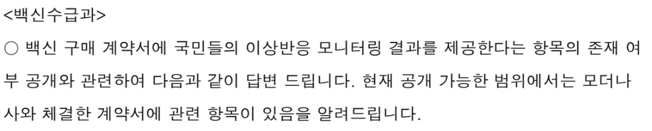 "이걸 한 번 보세요. 믿기 힘든 내용입니다. 질병관리청은 백신 접종 후 국민들에게 발생한 이상반응을 제약사에게 제공하기로 계약을 했다는 내용입니다"