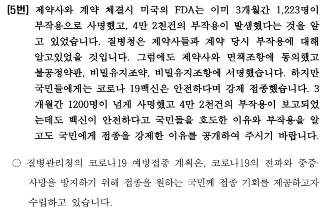 "정부는 모 제약사의 백신을 들여오기 직전 3개월 간(2020. 12 ~ 2021. 2)의 임상시험에서 1,223명이 사망했고, 4만 2천 건의 이상반응이 보고되었고, 그중 2만 5천 건이 의학적으로 확인된 이상반응이었다는 것을 알고도 계약을 했습니다"