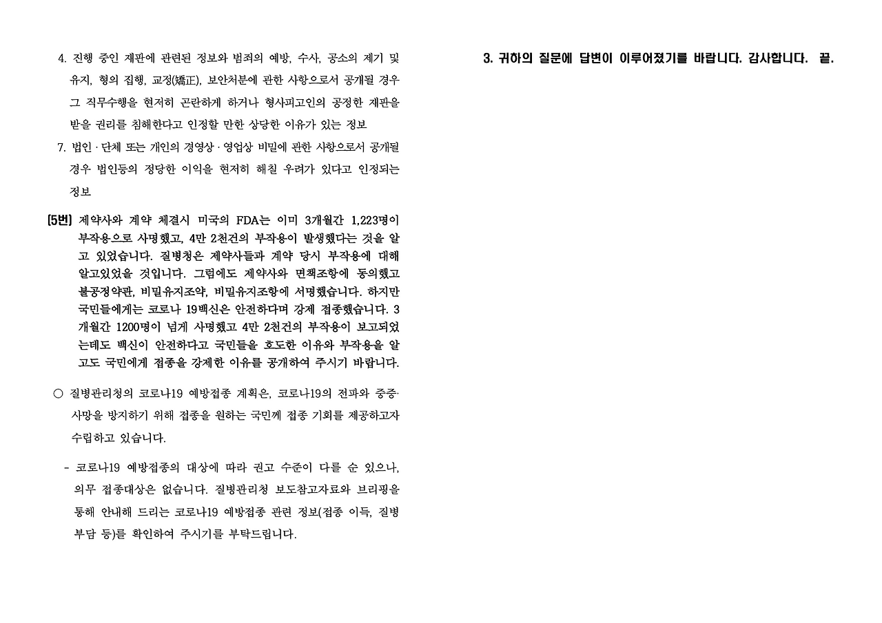 4. 문정부의 코로나 과장, 백신 구매계약서 공개, 이상반응 은폐, 청소년 이상반응은폐, 백신성분 검경 거부, 백신부작용 인과성 인정 등 국정조사, 청문회, 특검 실시