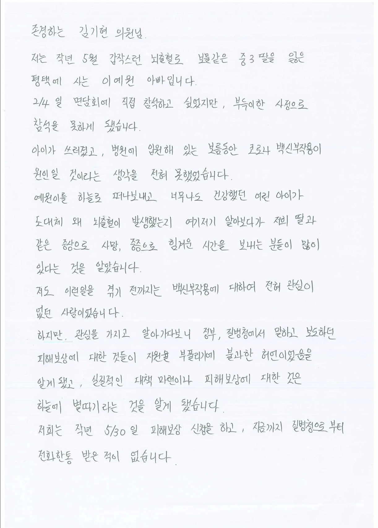 ■ 백신부작용으로 중3 딸을 잃은 부모가 눈물로 쓴 편지