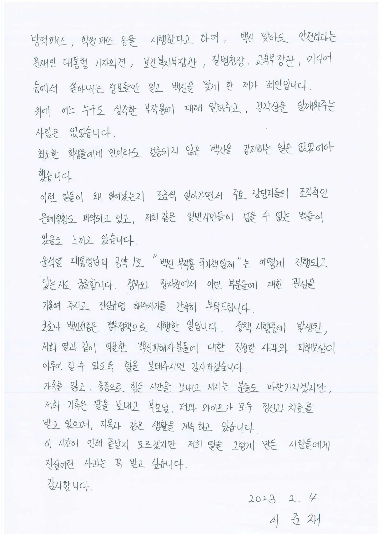 저희 딸은 경북외고 2학년에 재학 중 백신부작용으로 사망했습니다. 백신접종을 반대했던 저와 마찬가지로 저희 딸도 백신부작용을 걱정했지만 기숙사 단체생활 및 백신패스로 독서실 등에 출입제한으로 백신 접종을 고민했습니다. 당시 저와 저희 딸은 고3학생들의 백신접종 후 이상반응 여부를 확인 후 접종하기로 약속했습니다. 고3학년 학생들이 접종 후 사망, 중증 등 특별한 이상반응에 대한 학교나 교육부의 안내는 없었습니다. 학부모들의 제보에 따르면 접종 당시 현장에서 실신한 학생들도 다수였고, 중증 이상의 이상반응도 다수 보고가 되었는데도 학부모에게 알리지 않고 계속해서 접종을 한 이유를 납득할 수 없습니다. 학교에서 받은 가정통신문에는 부작용에 대한 내용은 전혀 없었고 접종 후 출결사항만 적혀 있었습니다. 접종 후 단 한 명이라도 사망했다는 이야기를 들었으면 접종했겠습니까? 만약 고3학년 학생 첫 사망사례인 강릉의 김준우 군의 사망사실을 학부모에게 알렸다면 어느 학부모가 아이들에게 접종을 찬성했겠습니까? 너무나 명확한 사실입니다.