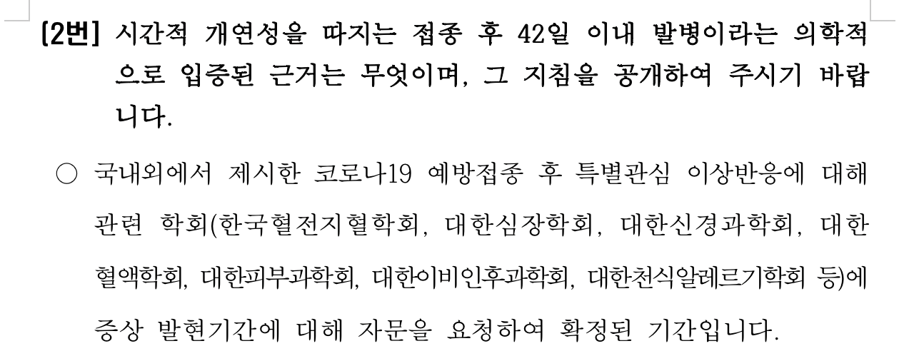 2번 : 전문의들은 접종 후 발병기간은 전혀 관련이 없다. 접종 후 10년 이후에도 부작용이 발생하는데 42일이라는 의학적인 근거는 없다고 합니다. 대한민국에는 코로나 백신을 제조할 만한 세계적인 제약사가 없고 그 연구 또한 미비한 상태입니다. 특별관심 이상반응에 대해 학회 수준의 자문으로 평가를 한다는 것은 질병청의 직무유기와 다름없습니다. 접종 후 42일 이내 발병해야 인과성을 인정한다는 의학적 근거를 제시해 주시고 관련 학회에서 어떤 자문을 받았는지 공개하여 주시기 바랍니다.
