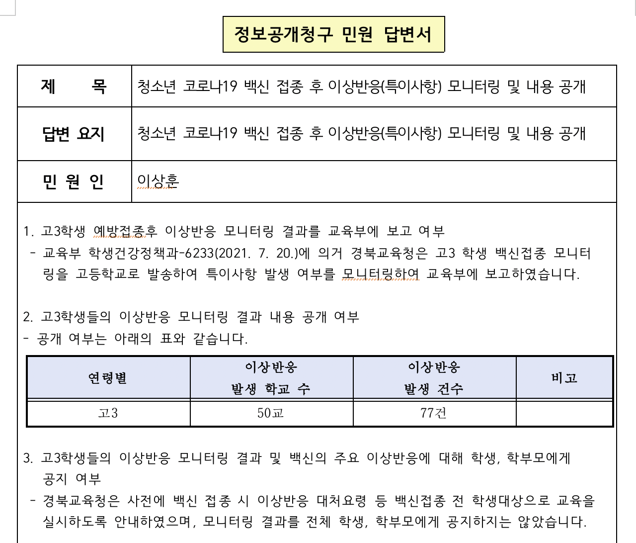 경북교육청 정보공개에 의하면 이상반응이 인과성을 인정받지 않았기에 학생, 학부모에게 알리지 않았다고 한다. 백신 접종 후 이상반응 모니터링의 목적은 인과성 인정과 상관없이 말 그대로 접종 후 이상반응을 모니터링하는 것이고 77건 중 사망 1건, 중증이상반응 30건이 나왔다면 이는 당연히 학생과 학부모에게 알렸어야 했다.