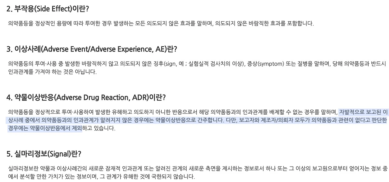 • 의약품안전관리원에서는 이상사례=부작용이라고 명시되어 있다.