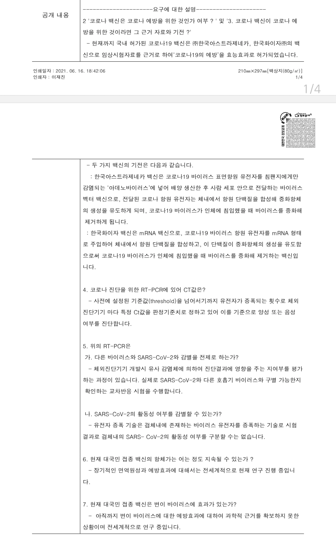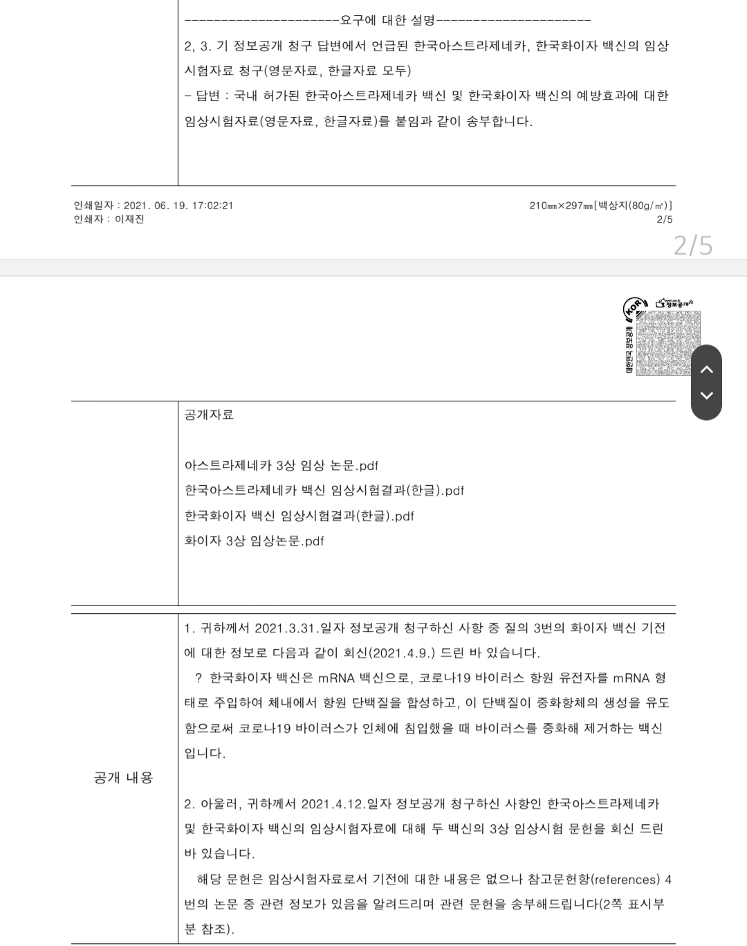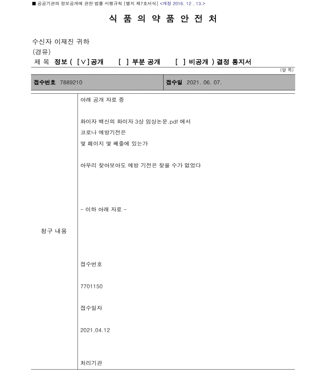 어느 의사가 식약처에 예방 기전(원리)을 공개하라 정보공개청구 ➠ 식약처는 논문 이것저것 공개