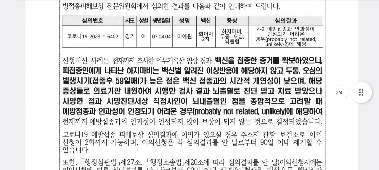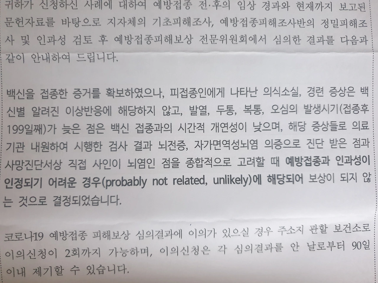 의학적으로 왜 이상반응이 아닌지가 적혀 있는 것이 아니라 그냥 질병청이 아니라면 아닌 거다. 하루 수천 건을 심의하고 건당 3~4초 걸리는데 슬비는 의무기록지가 약 250장 정도 되니 심의하는데 약 10초 정도는 걸렸을 거다. 2022년 8월 5일에 신청했고 2023년 6월 7일에 받았다.