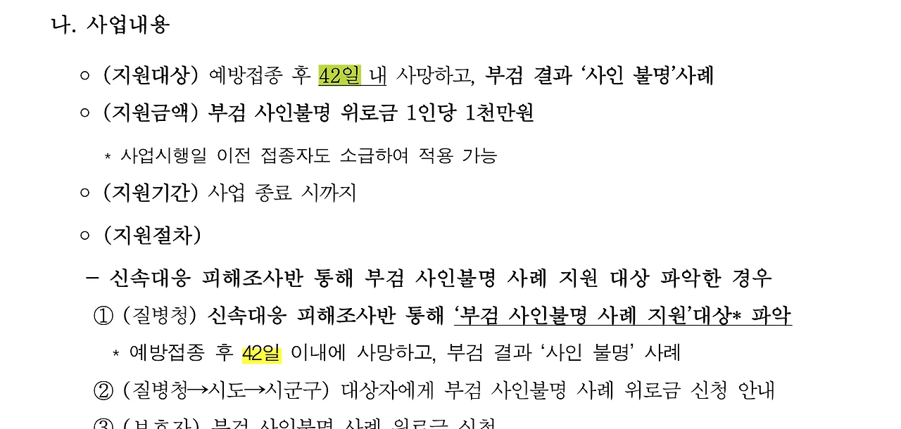 백신 접종 42일 이내 돌연사 후 부검에서 사인불명 시 위로금 1천만 원 지급하겠다는 질병청