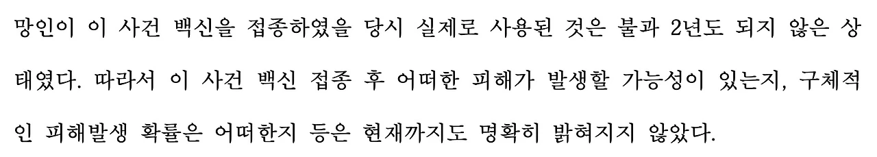 이번도 그렇고 기존의 판결문에서도 '시간적 밀접성'이 가장 첫 번째 사유로 등장하고 있습니다. 하지만, 판결문에서는 접종 2년밖에 안되어 어떤 피해가 발생할지 알 수 없다고 일말의 여지를 남겨두고 있습니다.