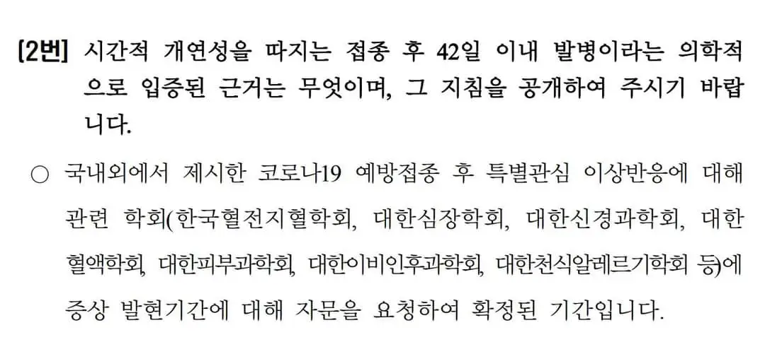 42일 이내 발병에 대한 의학적 근거를 제시하라는 청구에 대한 질병청의 답변