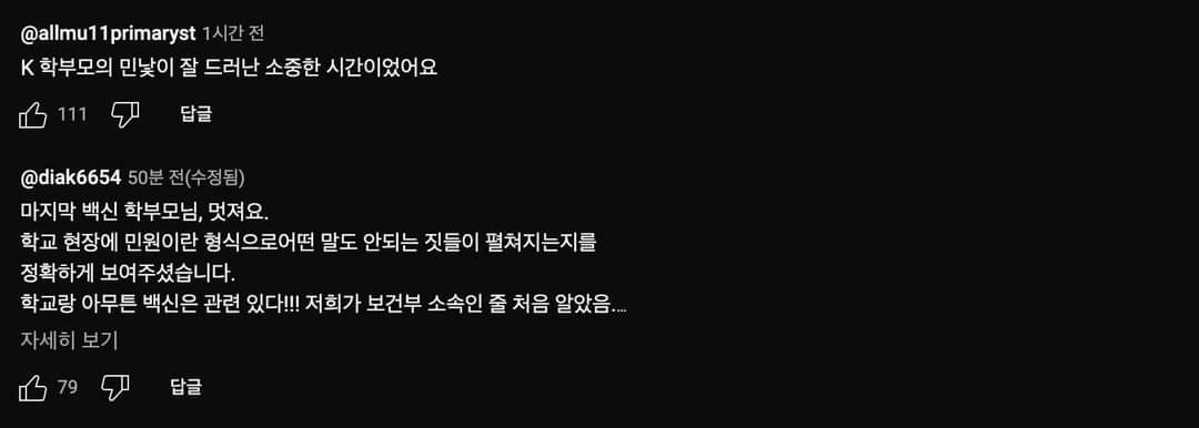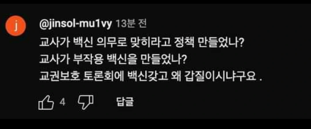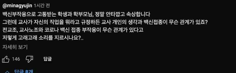 백신부작용 피해 학생들에게 관심을 가져달라는 학부모 단체에 대한 교사들의 댓글들