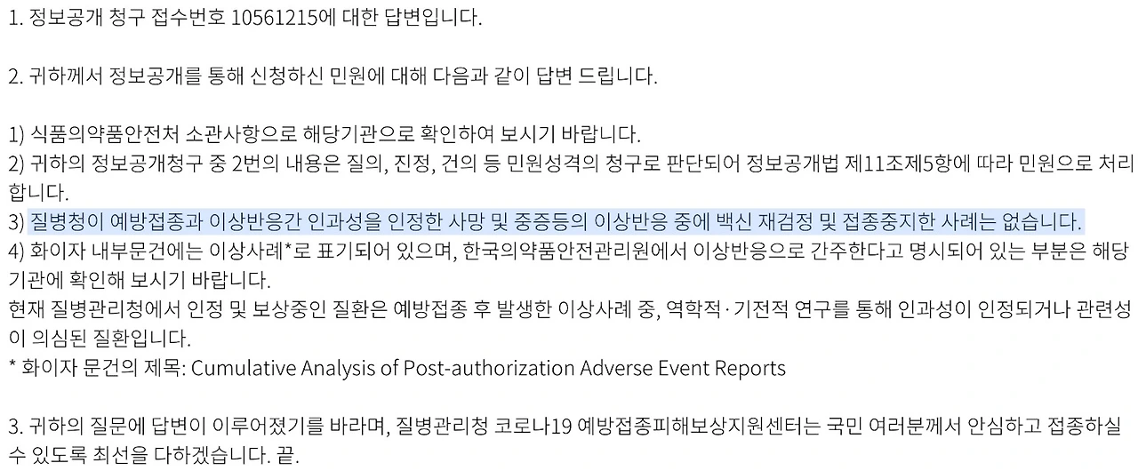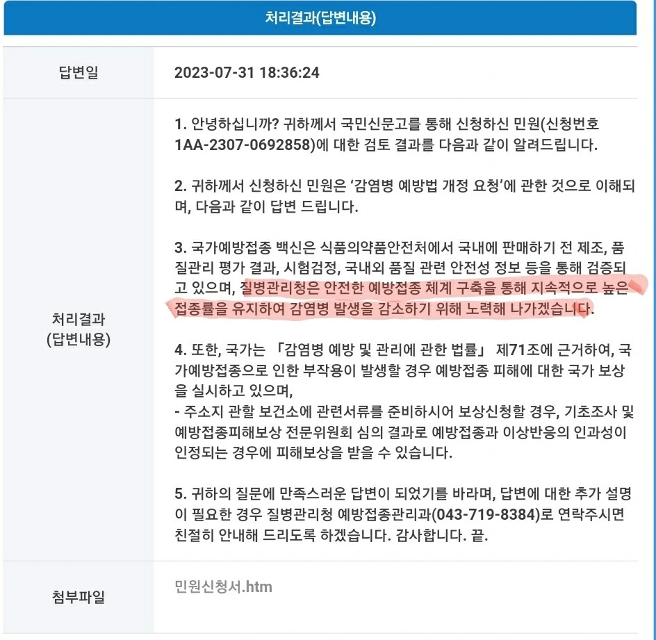 백신 안전성을 철저히 검증해 달라는 민원에 질병청 답변